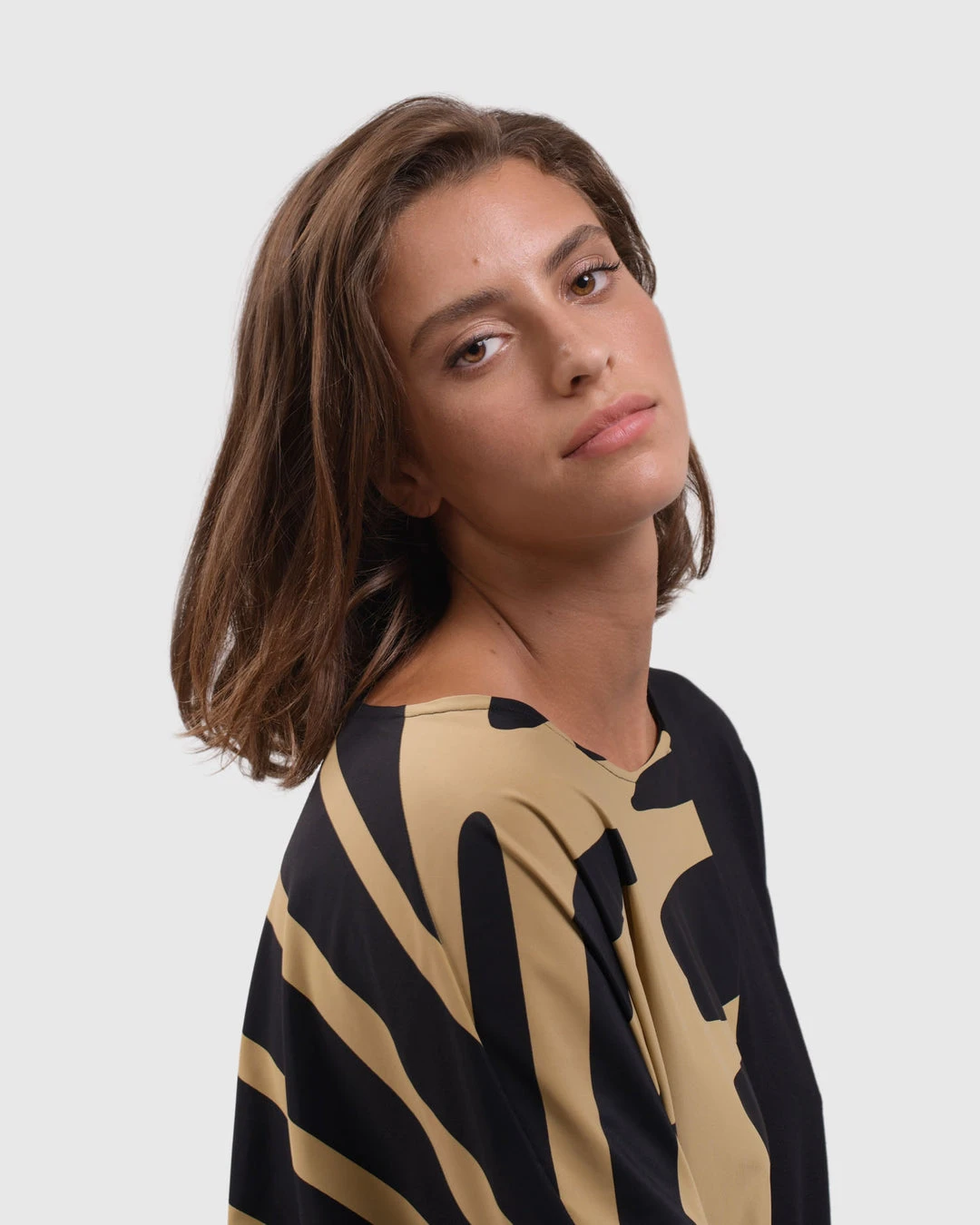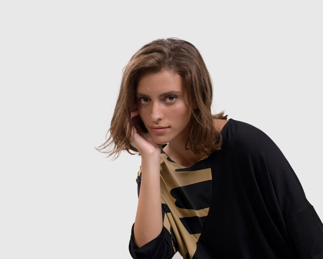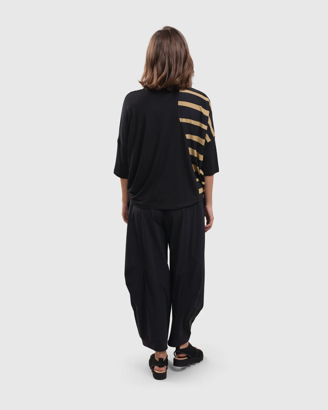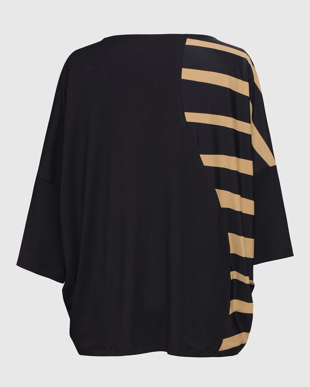 A favorite silhouette from Alembika, this relaxed top has a roomy body that tapers to hemline, creating a side drape. It’s finished with a round neckline and short dropped sleeves. In a mixed body of jersey knit, it features a wavy seamed accent panel at one side in bold striped Tekbika stretch knit.