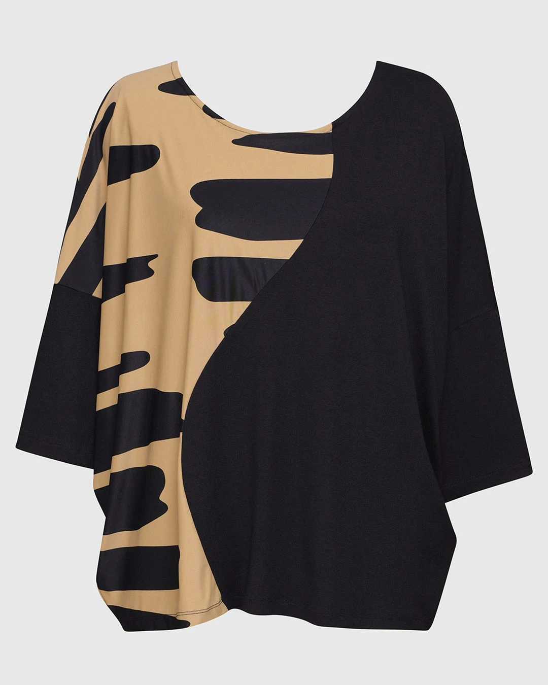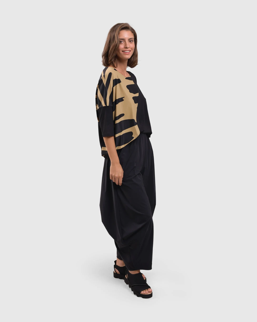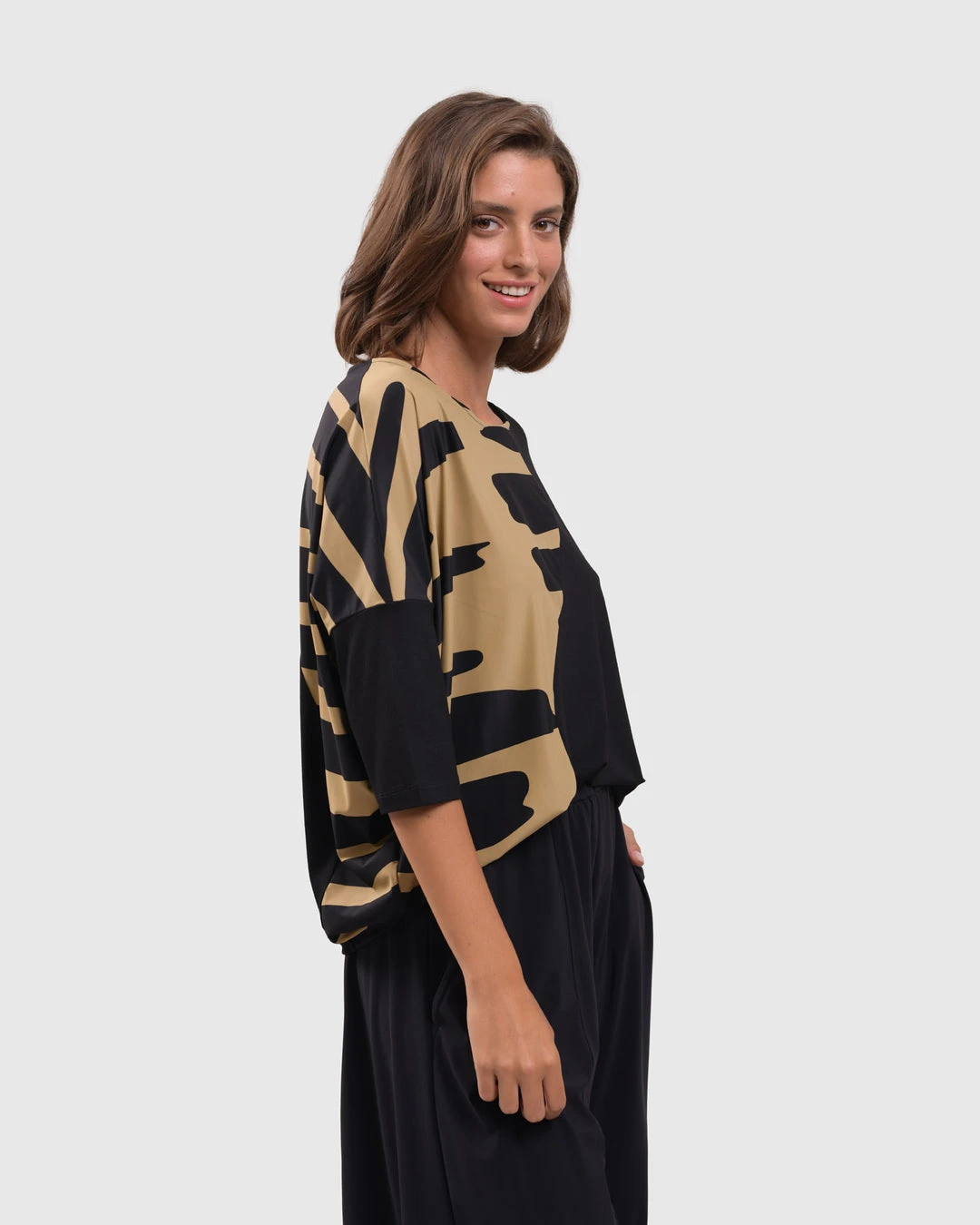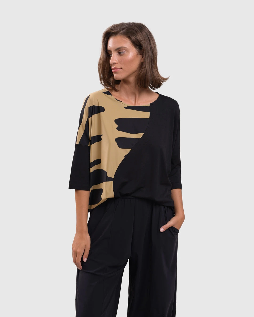 A favorite silhouette from Alembika, this relaxed top has a roomy body that tapers to hemline, creating a side drape. It’s finished with a round neckline and short dropped sleeves. In a mixed body of jersey knit, it features a wavy seamed accent panel at one side in bold striped Tekbika stretch knit.