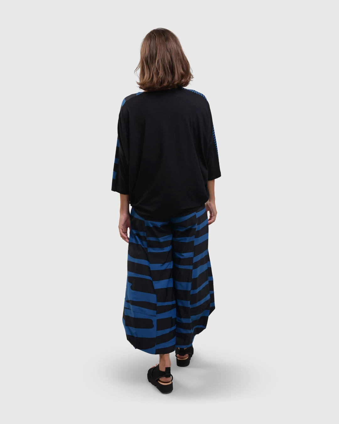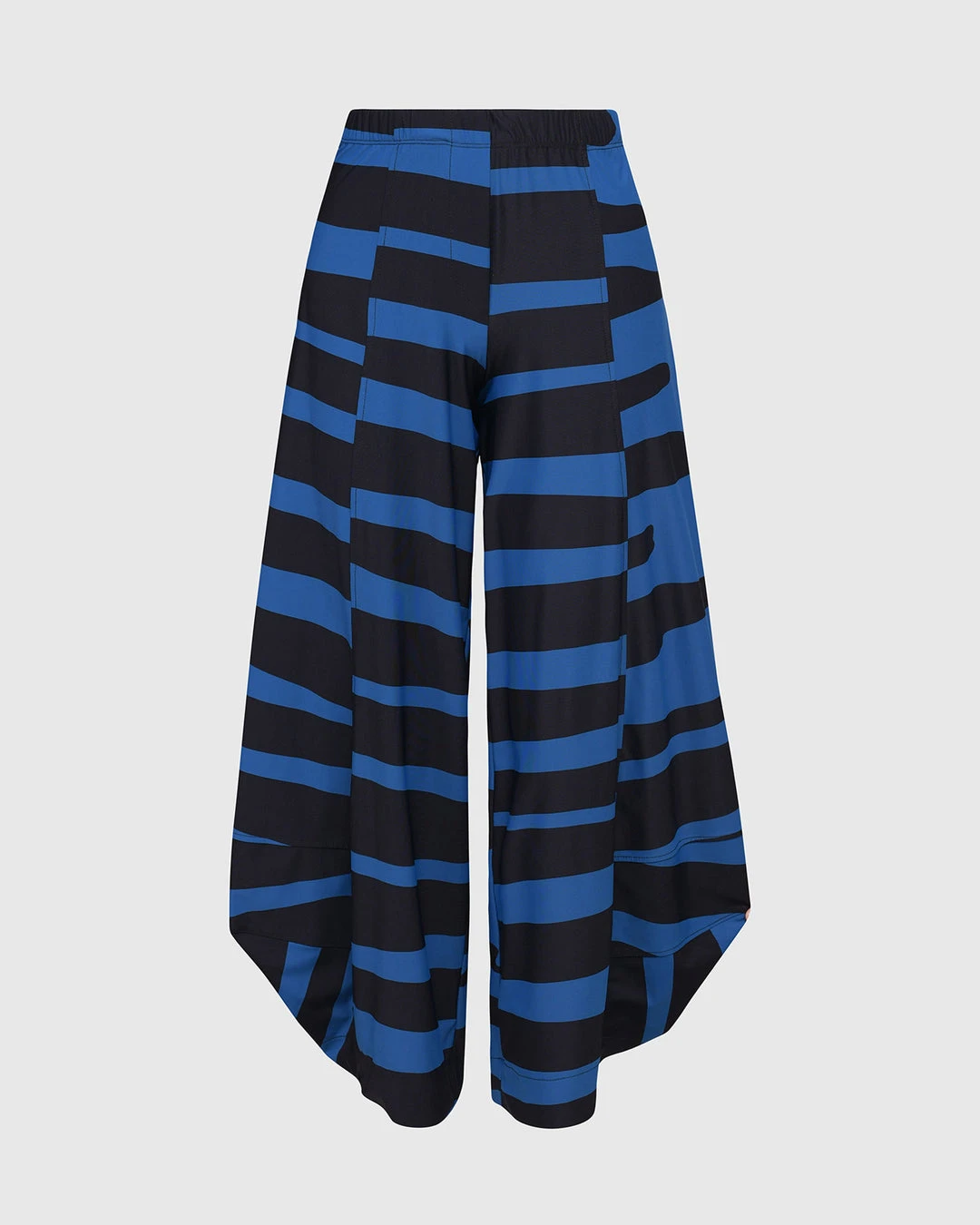 An Alembika favorite and signature silhouette, the punto pant style has seam detail ballooned legs with faux fly detail at elastic stretch pull on waist. In a bold striped print in signature Tekbika fabric.