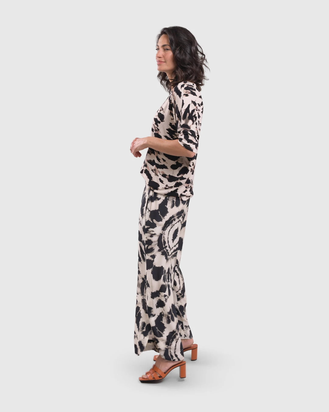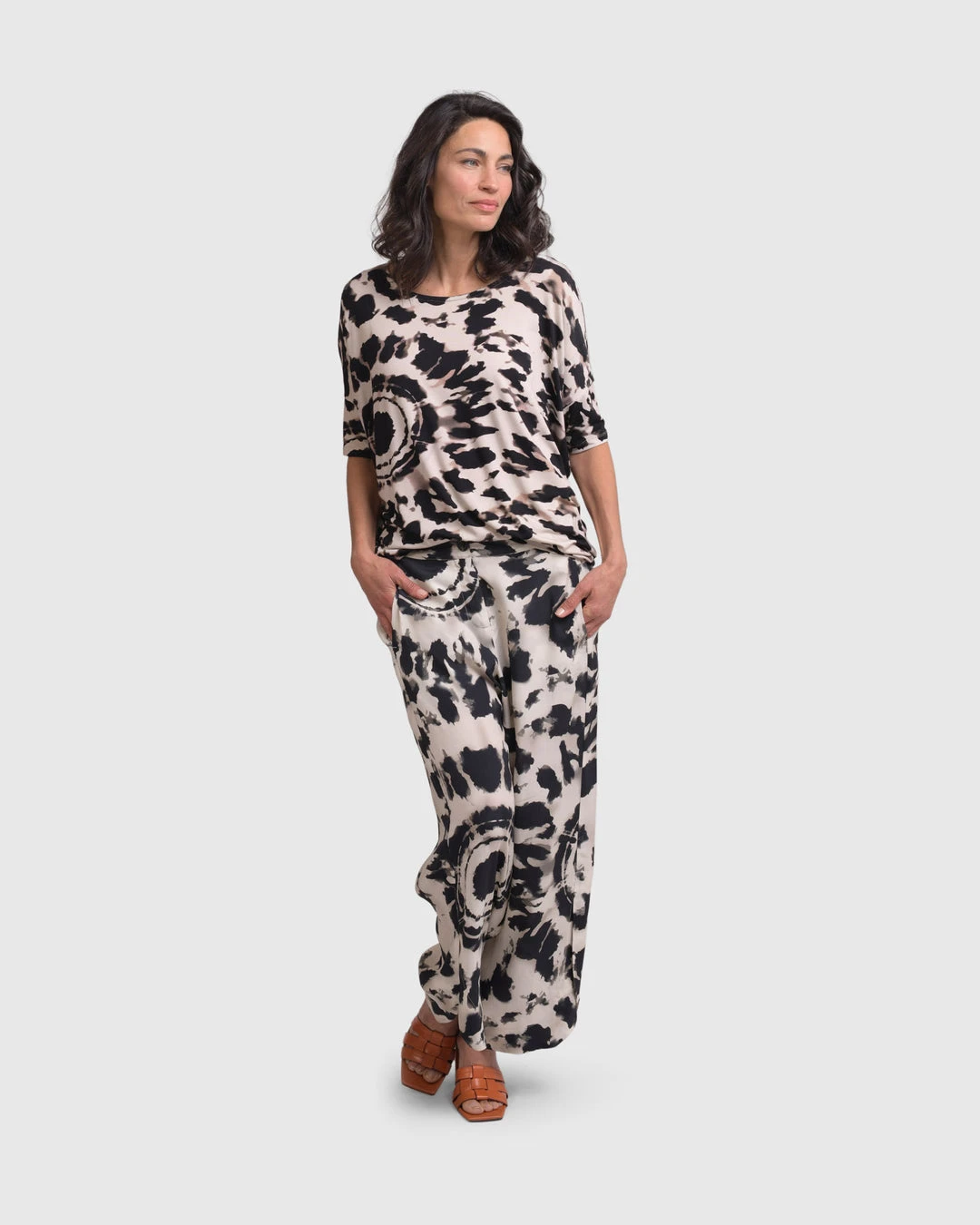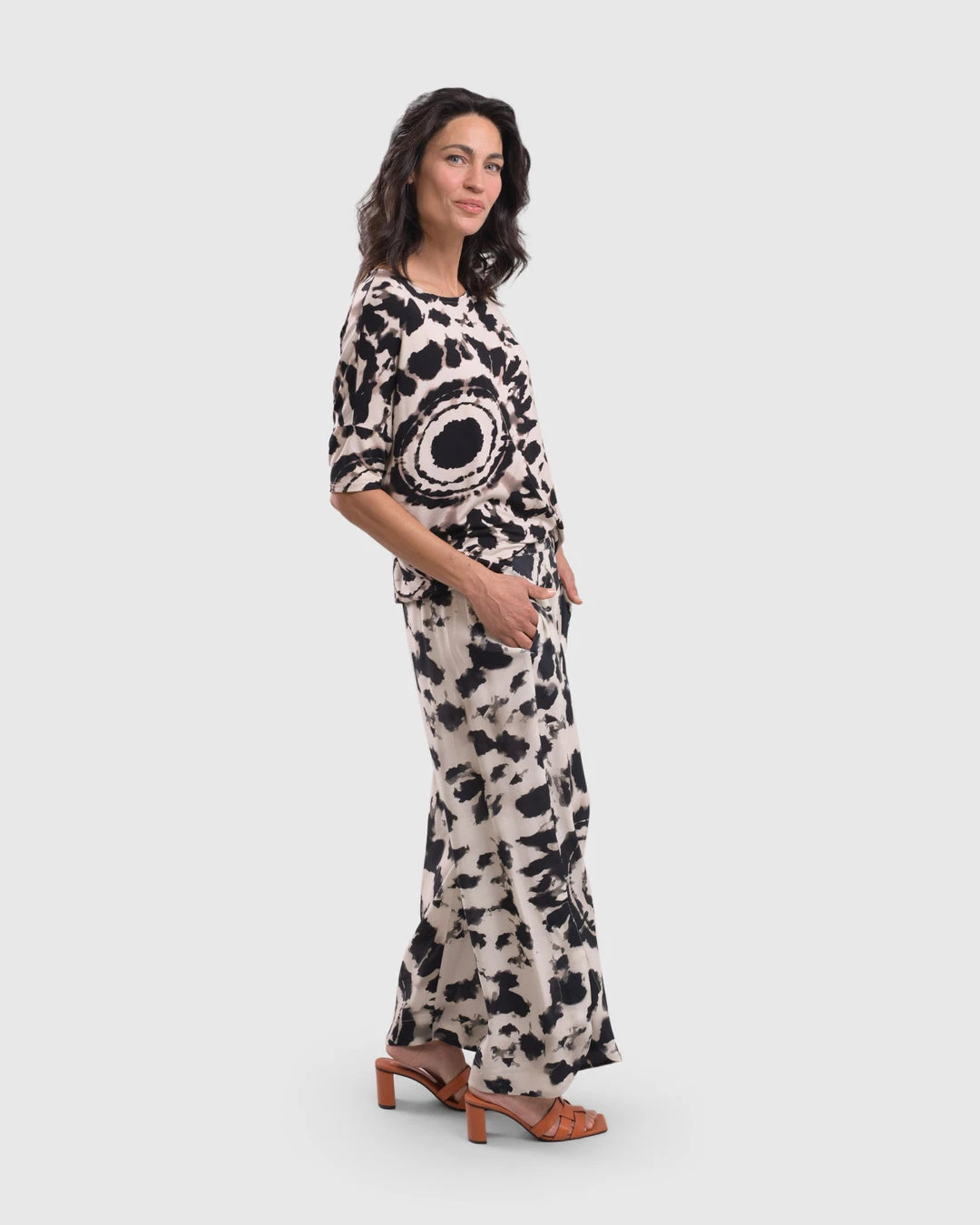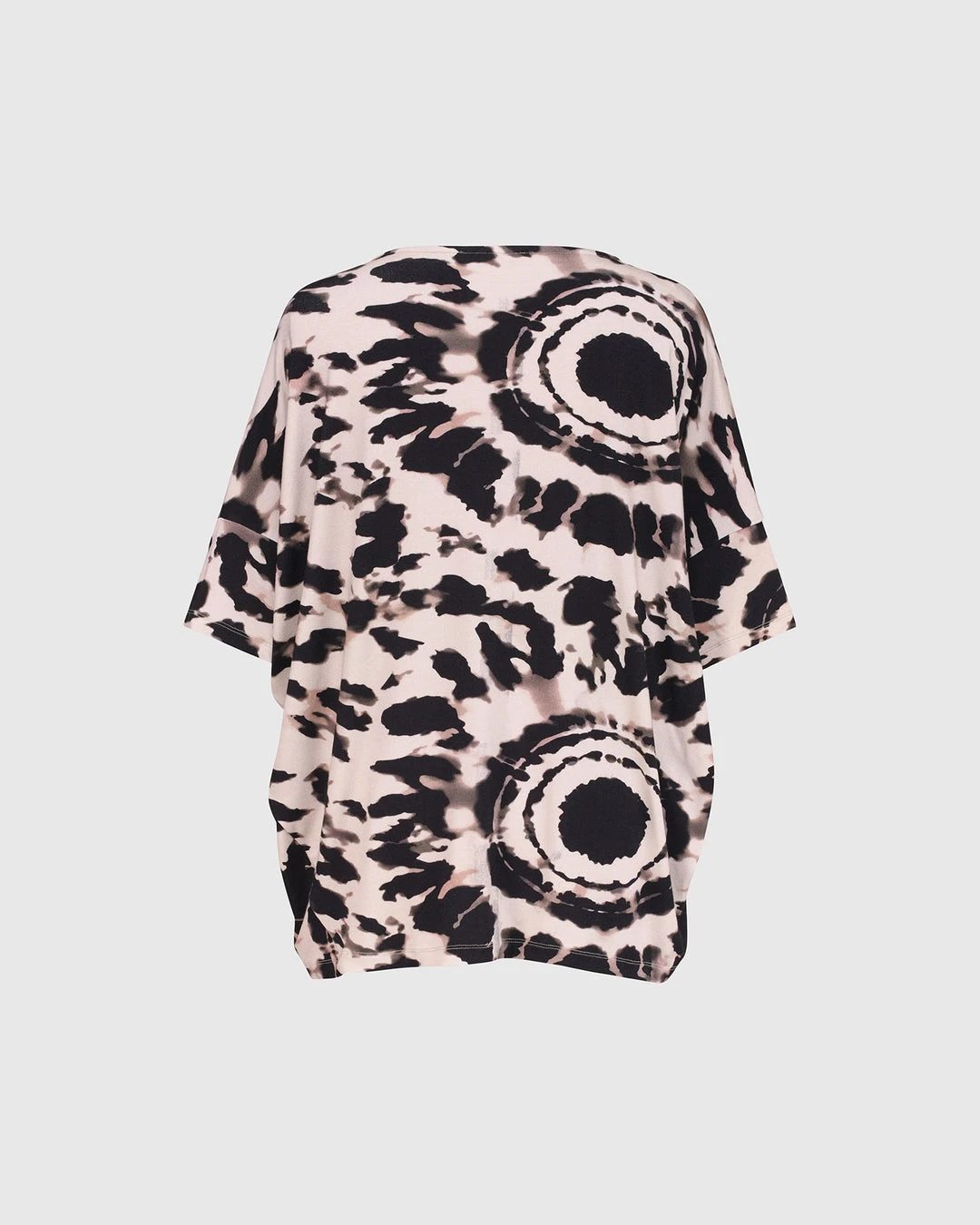 A favorite silhouette from Alembika, this relaxed top has a roomy body that tapers to hemline, creating a side drape. It’s finished with a round neckline and short dropped sleeves. In a buttery soft tribal tie dye printed knit, it’s effortless and chic.