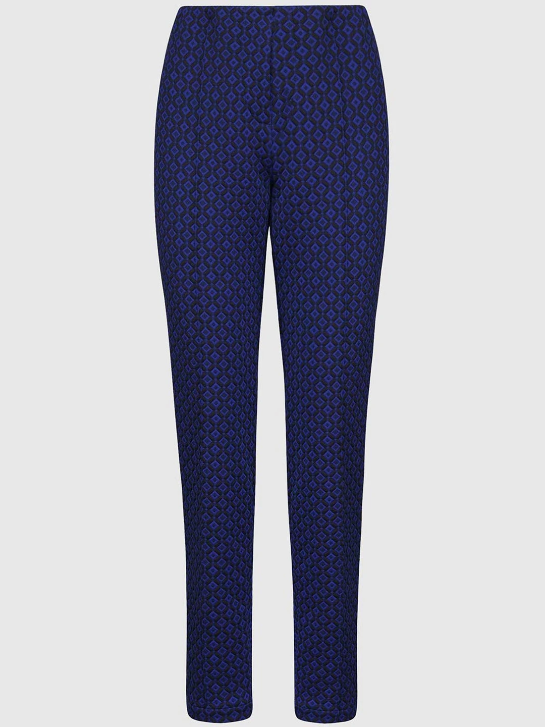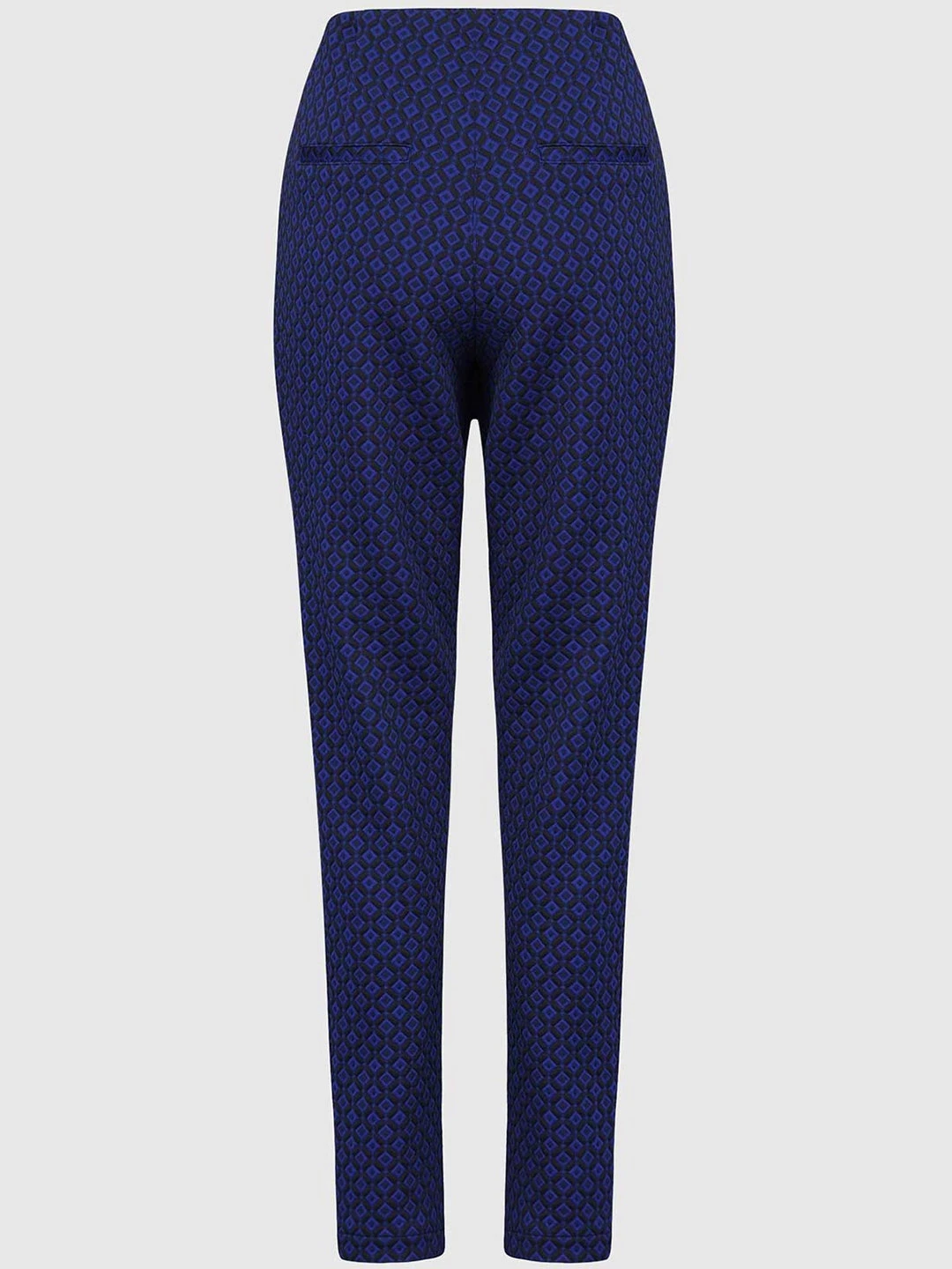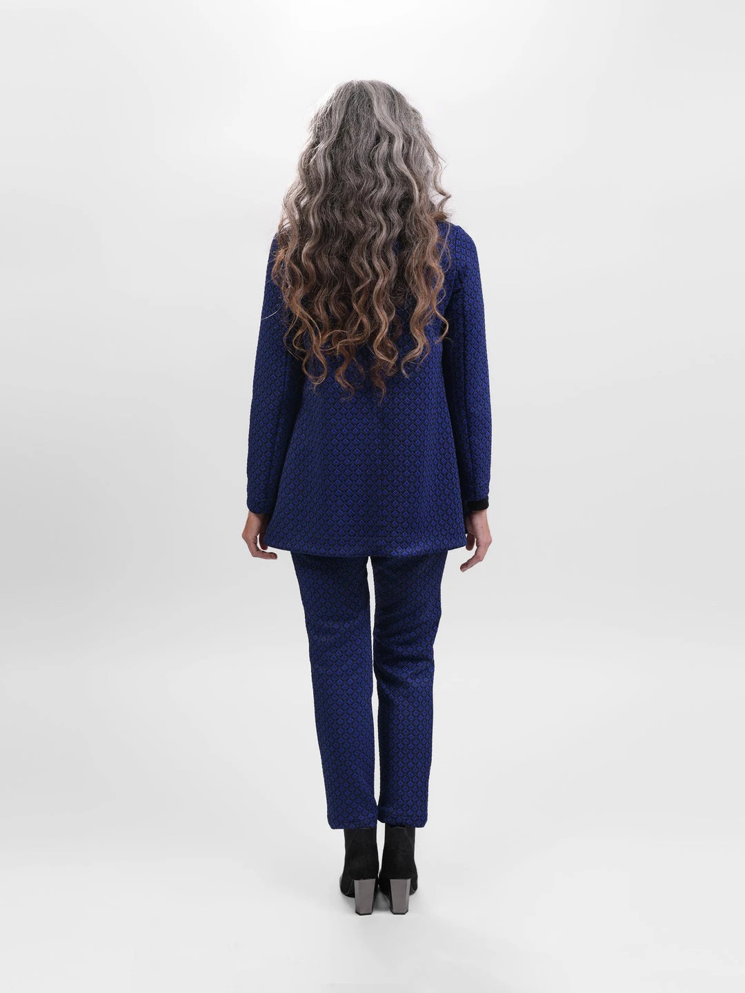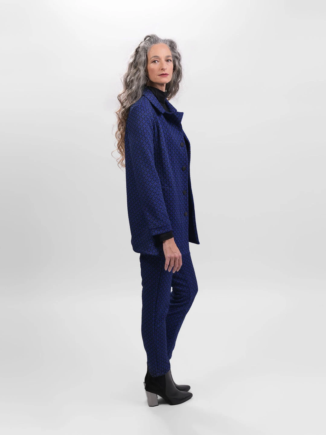 This slim leg pant from Alembika is done in a rich squares pattern jacquard knit. Trouser style detailling includes front seam and faux back pockets, with faux fly detail at the pull on waist.