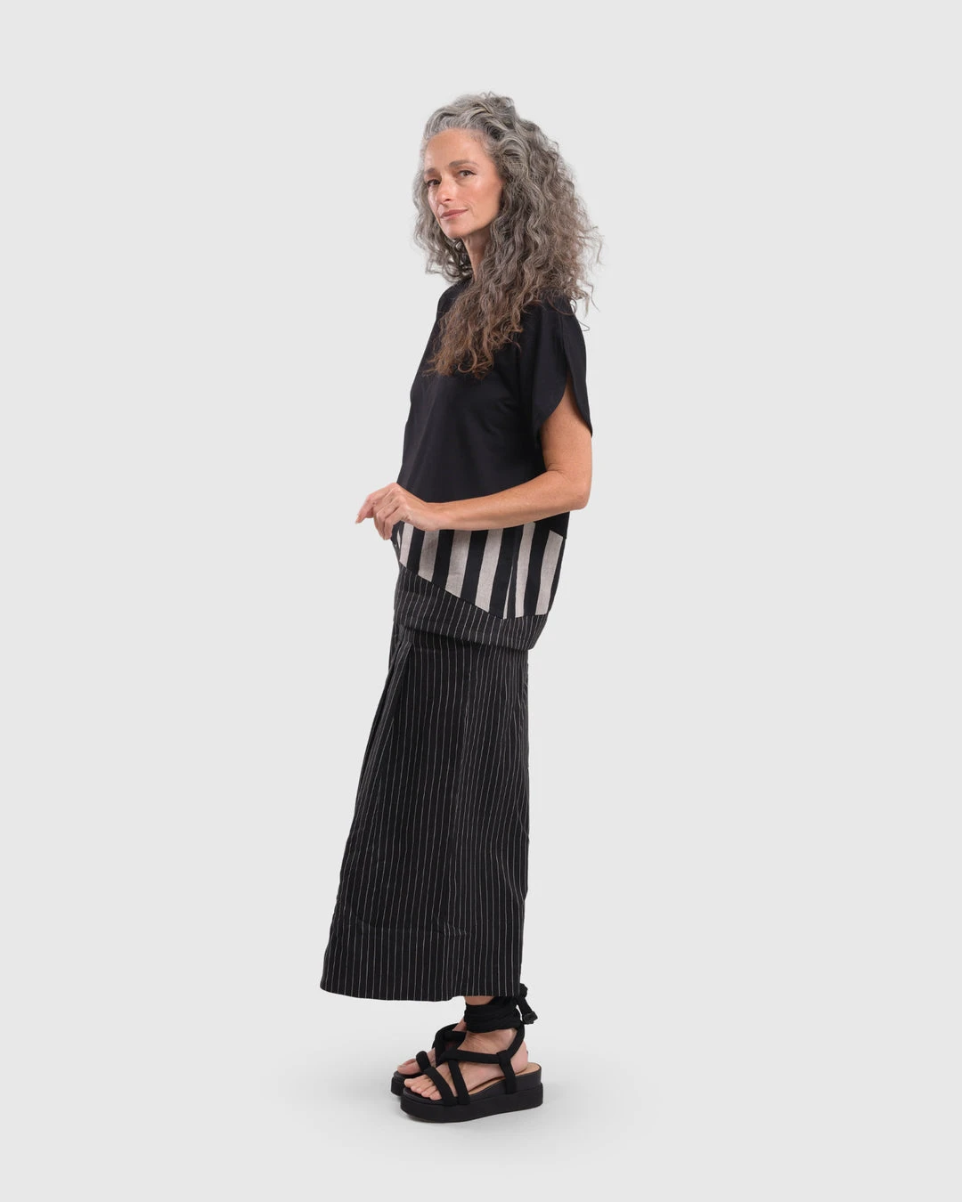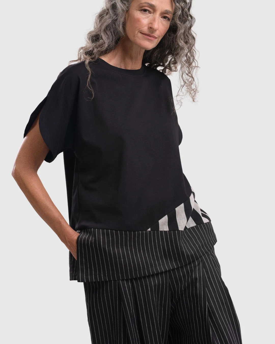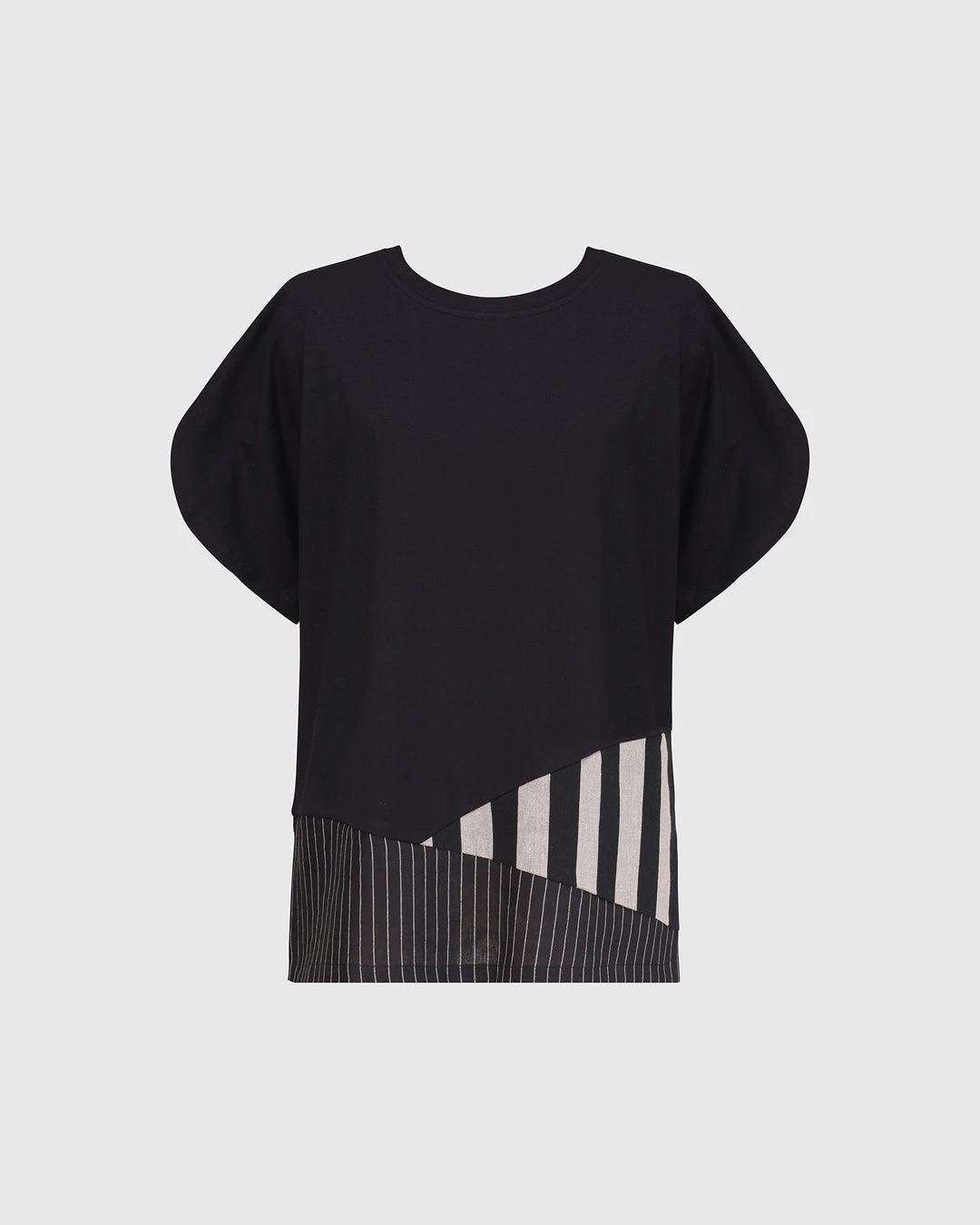This easy tee has beautiful touches, elevating it from the norm. With a short boxy body in jersey knit, it features an asymmetric mixed panel accent at hemline, along with short vented sleeves. A round crew neckline and even hemline with side vents completes the look.
