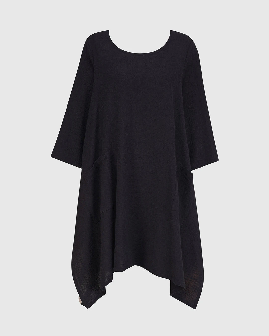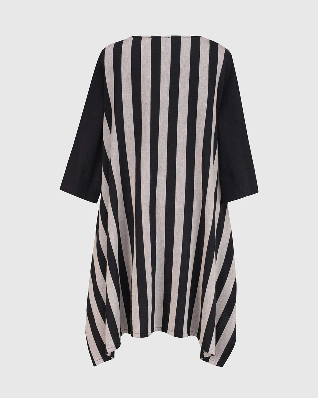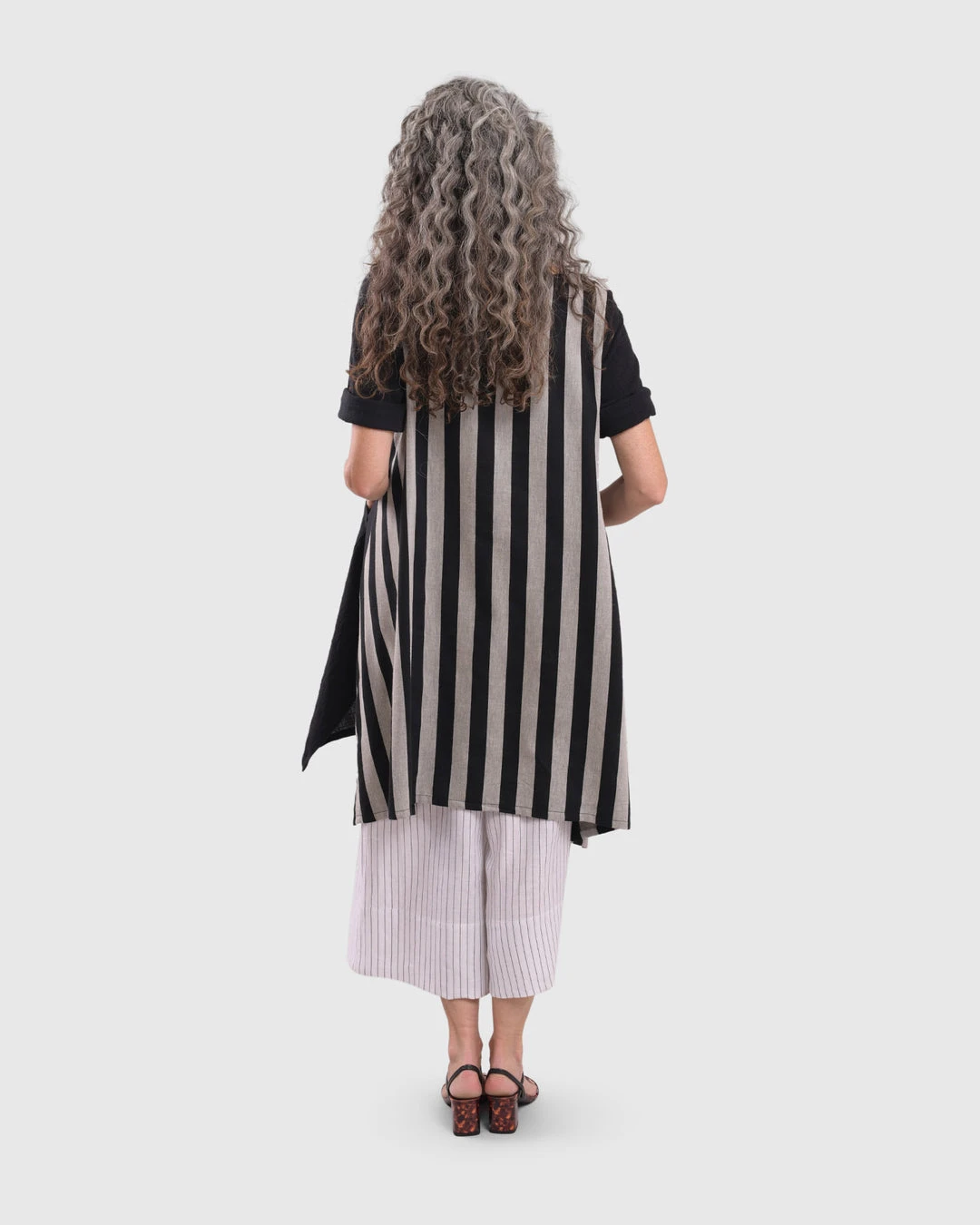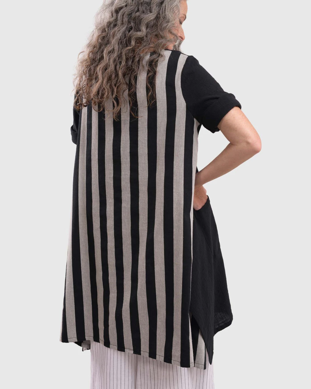 This breezy tunic has a roomy relaxed body and features a striped woven back with solid gauze at front. Accent pockets, a round neckline and high low hemline with angled side vents complete the look.