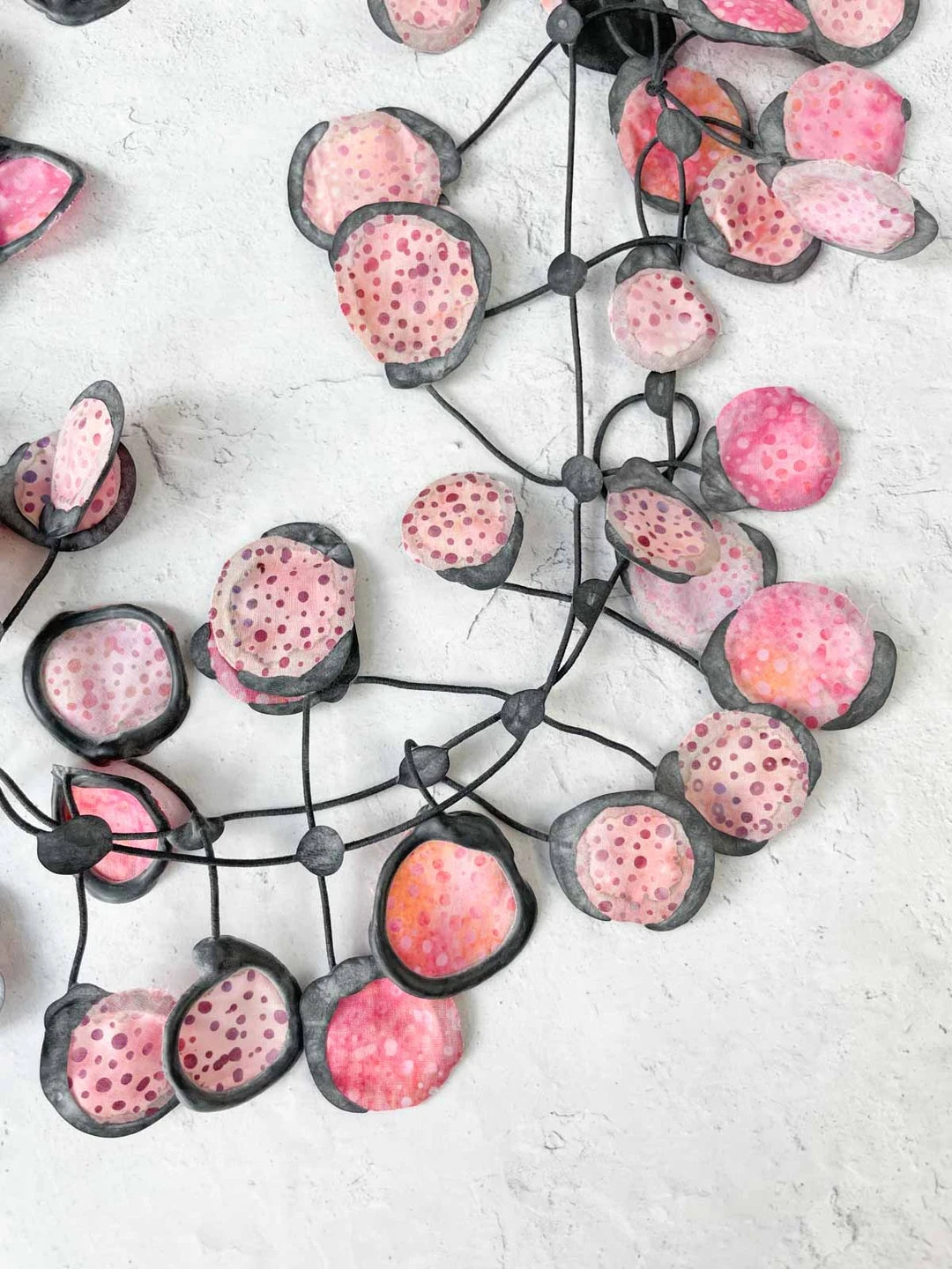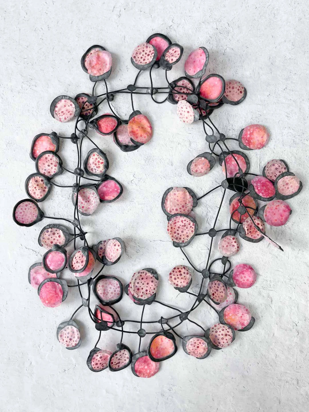 Large batik fabric “petals” are trimmed in black rubber and tied along thin black stretch cord. Wear long, doubled up or tripled as a collar – even wrap around the wrist as a bracelet! Have fun layering multiple styles and colors to create a truly unique look!