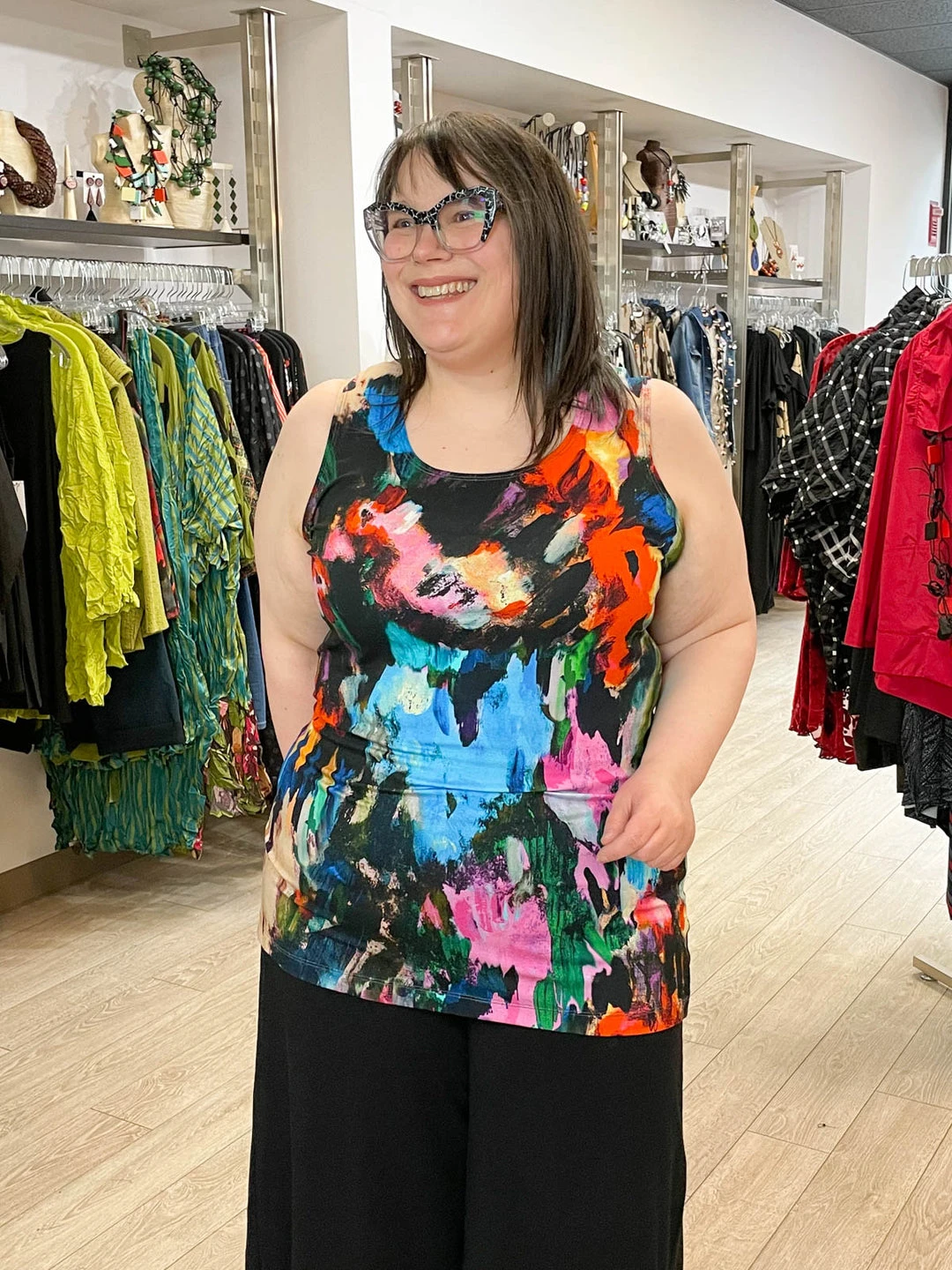 This slim fit tank is the perfect layering piece in a vibrant brush stroke print. With a scoop neckline, wide tank straps and a body skimming fit, it’s perfect to layer with cover ups, toppers and jackets without added bulk.