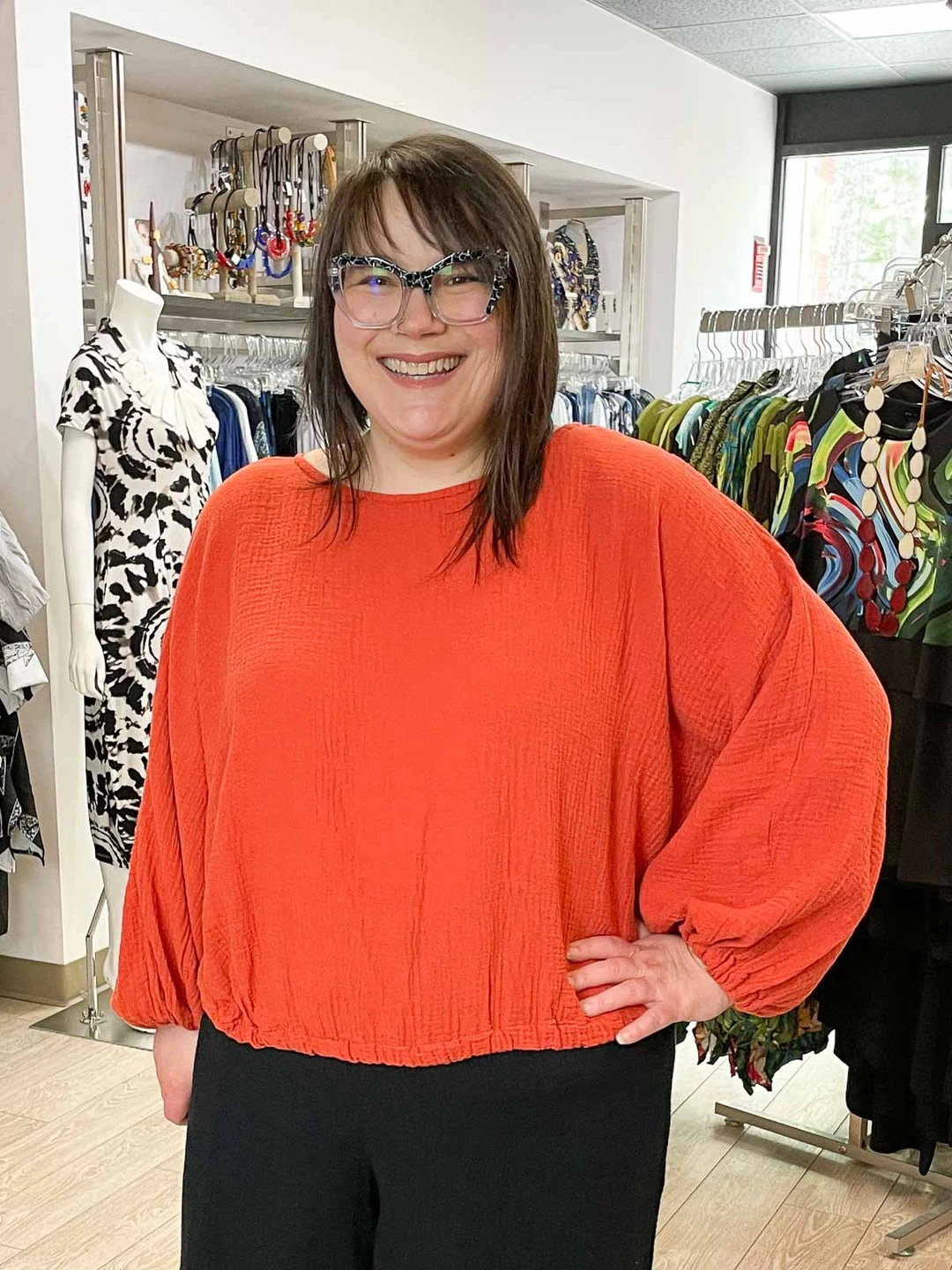 The Gianna Shirt from Bryn Walker stands out with a short oversized body that features gathered elasticized detail at the hemline and sleeves creating a bubbled look. This style has a high round neckling and full dolman set sleeves. Perfect to wear on it’s own or layer over a fitted top.