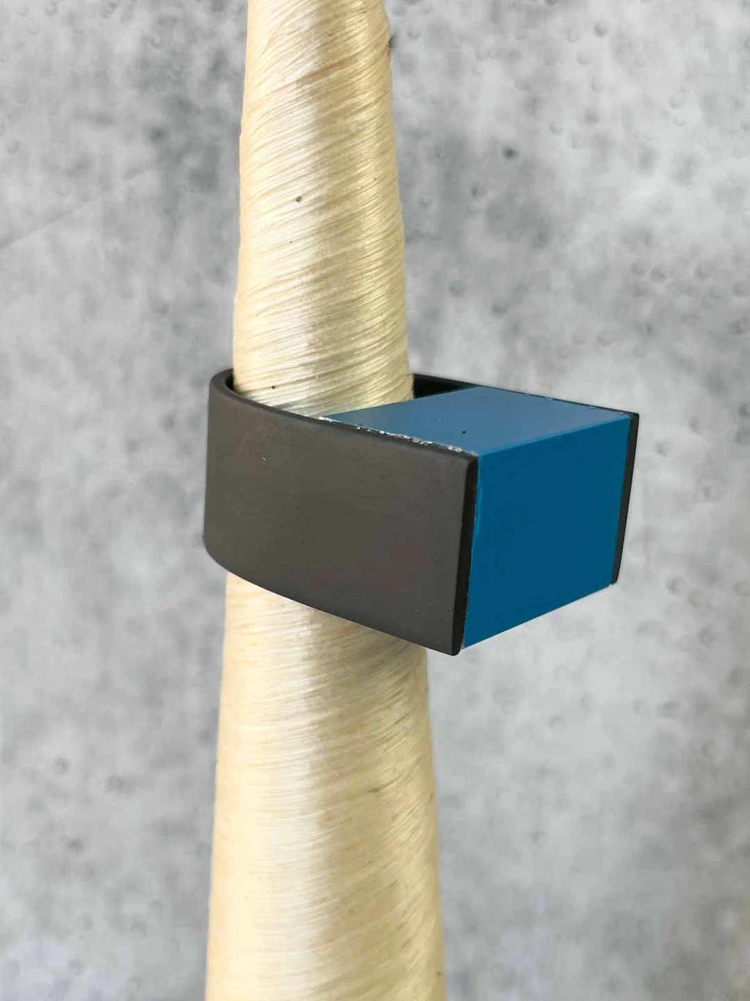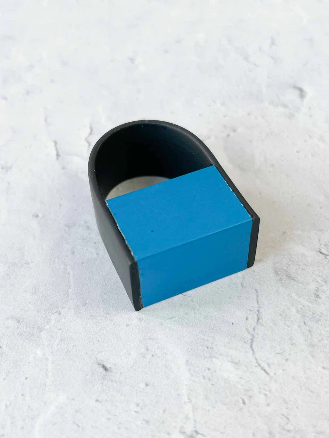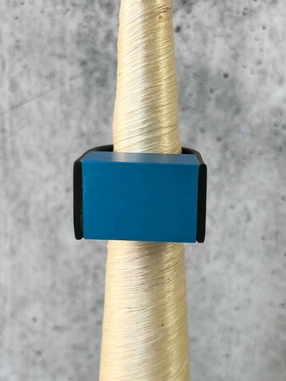 This fun statement ring from Christina Brampti features a rectangular aluminum bar on matte black rubber.