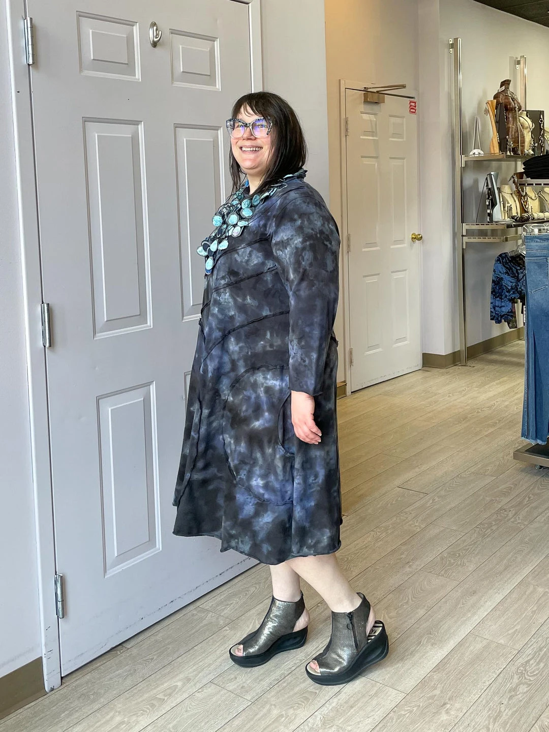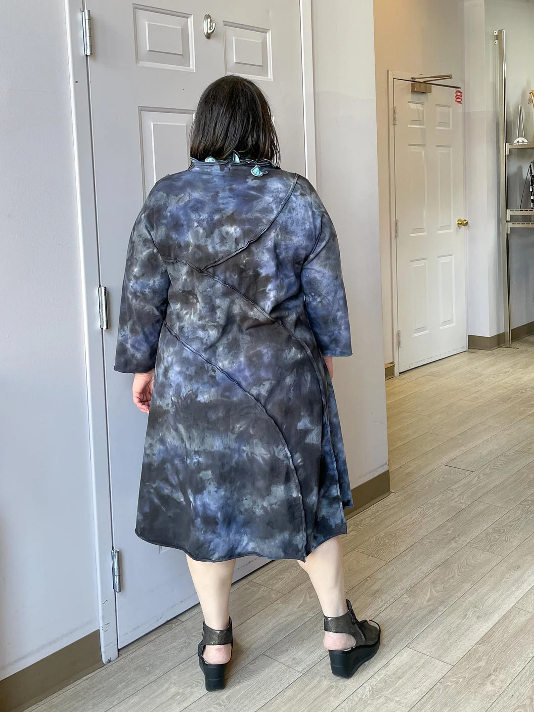 Cynthia Ashby’s Circle Dress is a casual yet artsy style in a cotton jersey knit. With all-over Storm hand-dye in black, greys and blues, this dress features a full a-line body with raw edge seam details throughout. Circle shaped pockets at sides, three quarter set in sleeves and a high round neckline complete the details. Uneven raw hem hits at knee.