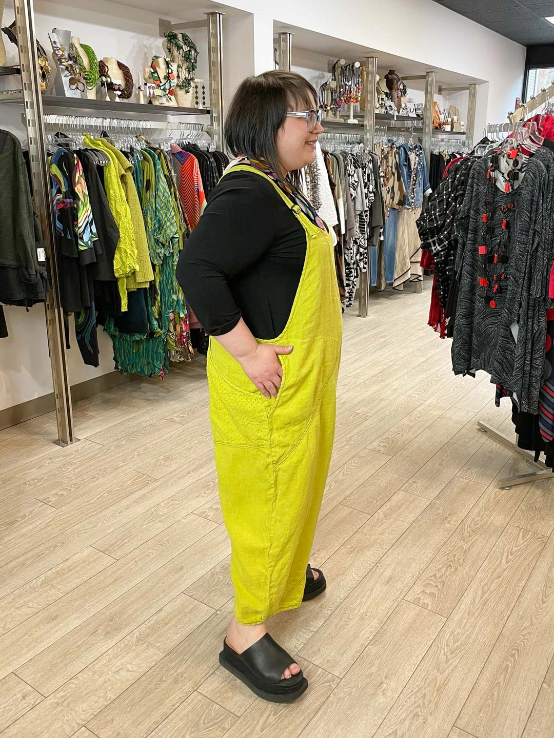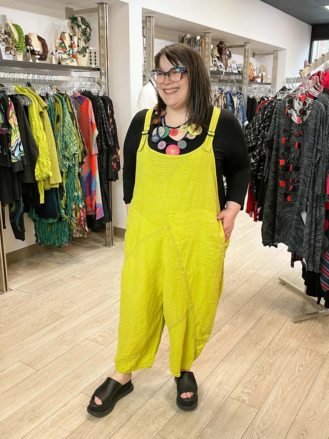 Cynthia Ashby’s Grant Overalls are a sleeveless bib style jumpsuit with a relaxed body and cropped latern shaped legs. In easy linen woven, the roomy relaxed body features accents of eyelet accents throughout, including at the bib front, legs and rear pockets. Unique angular seam details has black contrast stitching. Side seam pockets and adjustable buckle straps finish off the details.