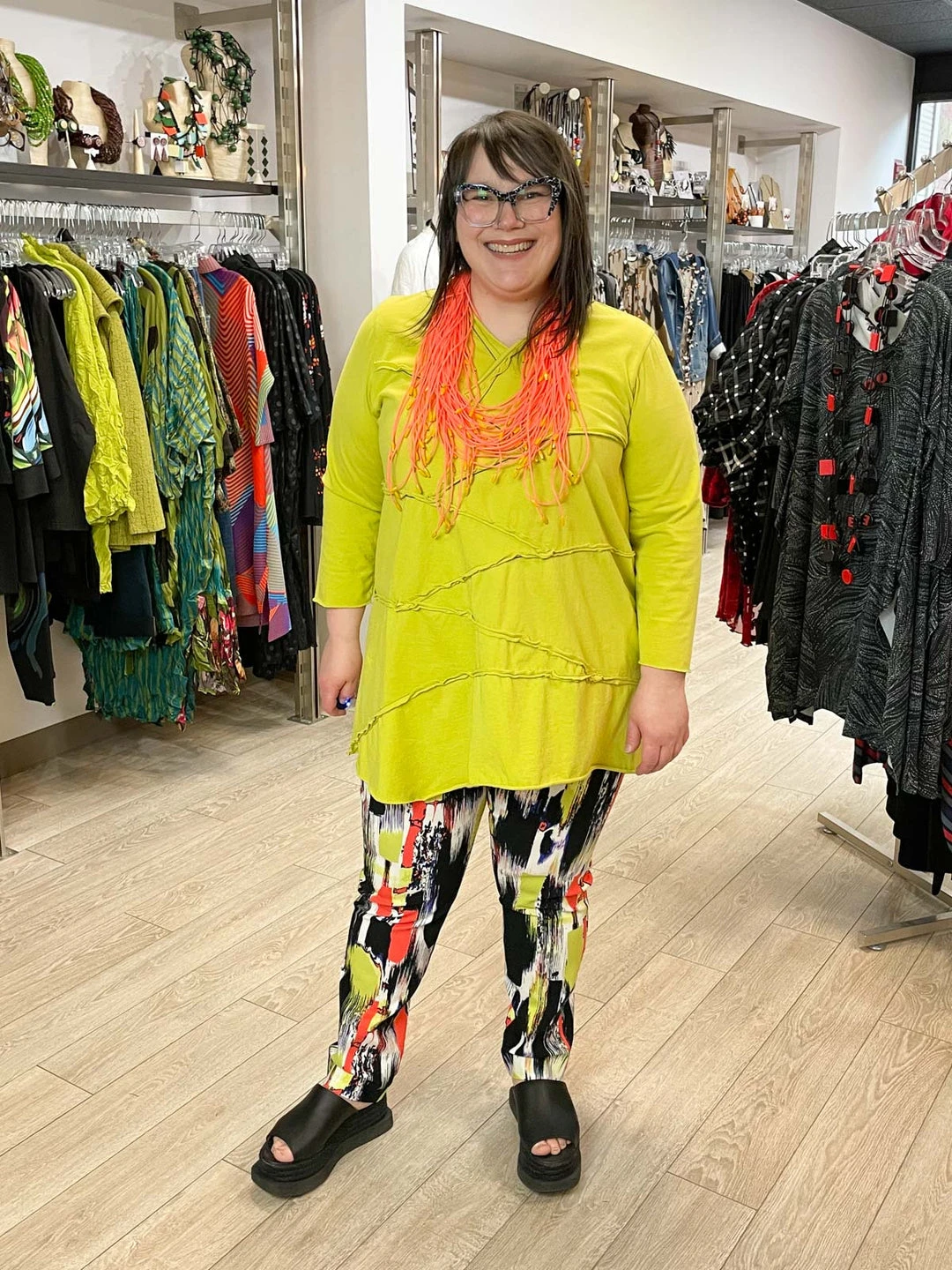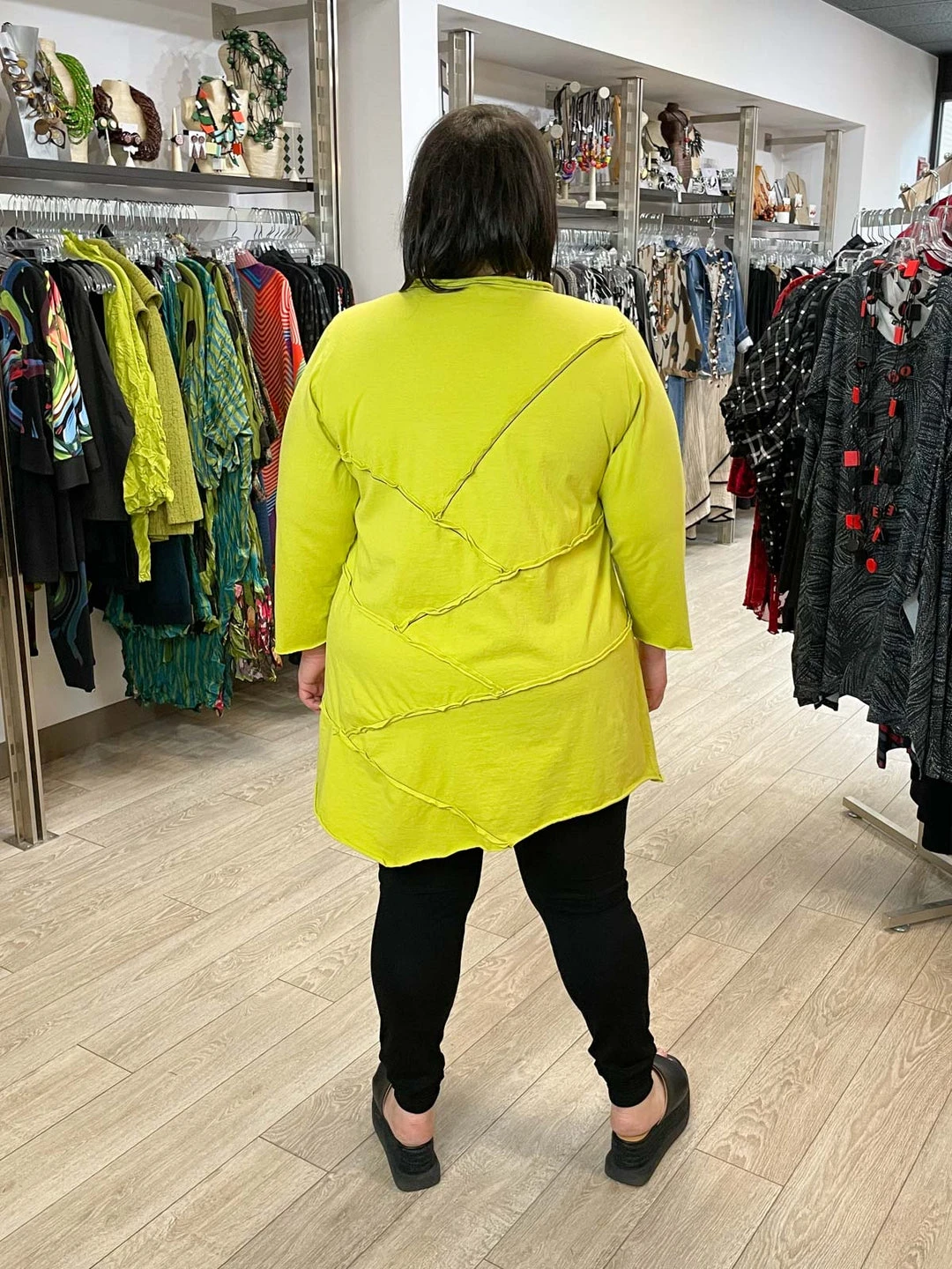 Cynthia Ashby’s Sonoma Tunic features her signature raw finish zig zag seam details at front and back. The relaxed body features a v neckline, three quarter sleeves and angled asymmetric hemline.