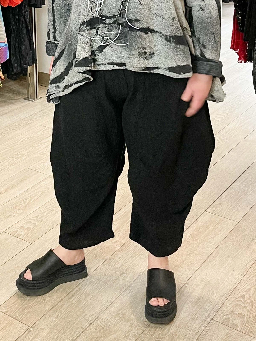 Dress To Kill’s Kam Pant shows off full ballooned legs created by tuck pleat panels. Stretch pull on waist with side seam pockets. The Black Gauze fabric is a great basic in solid linen gauze.