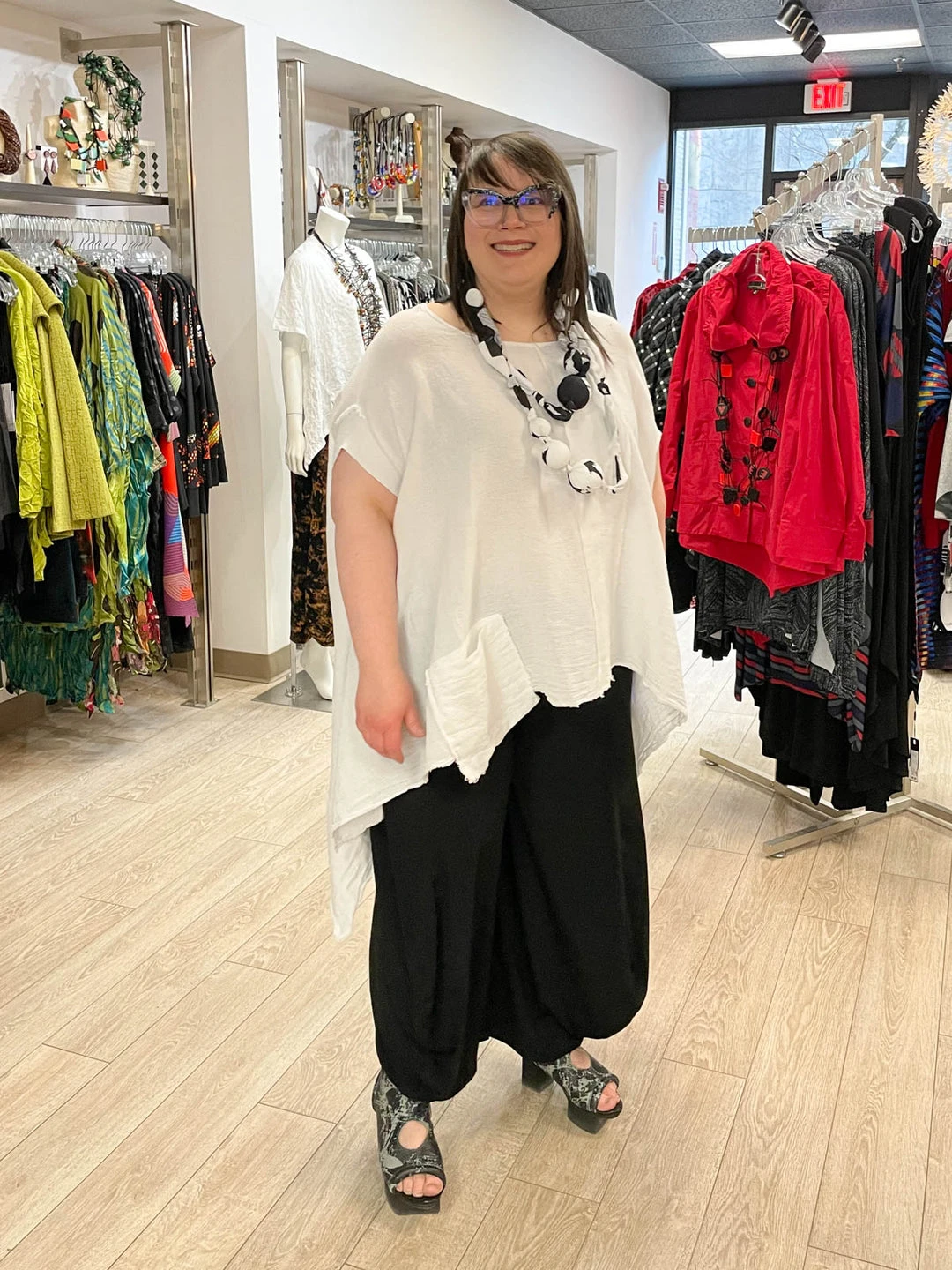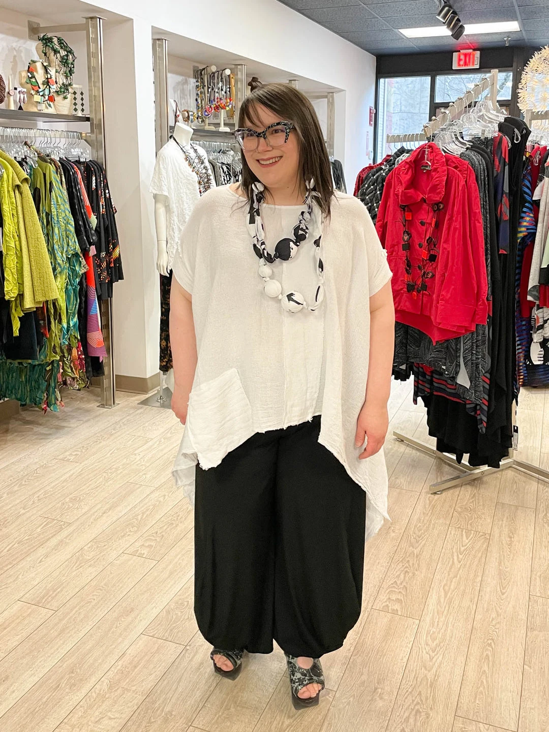 The Asya Tunic is the perfect summer top in open weave gauze. With an oversized body, this top features an offset vertical panel at front, a pocket at side and a curved high low hemline with side vents. The generous silhouette has true-to-size short sleeve openings and it’s unfinished seams add a sophisticated edge.