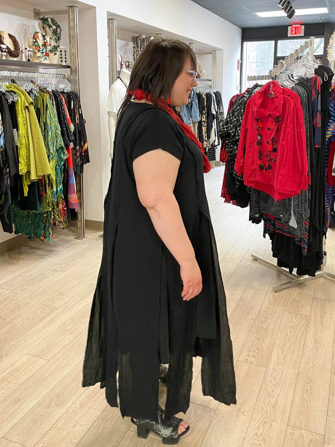 Igor’s Kali Tunic is sure to stand out in a breeze open weave gauze. The relaxed a-line silhouette features vertical panels throughout with waist high slits creating a “carwash” type effect, with a hemline that hits at mid-calf to ankle. The neckline has a notched look that folds over, while the arm holes have a cap sleeve look. The raw edges add a chic edge throughout.