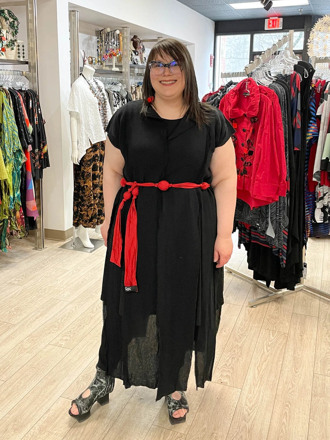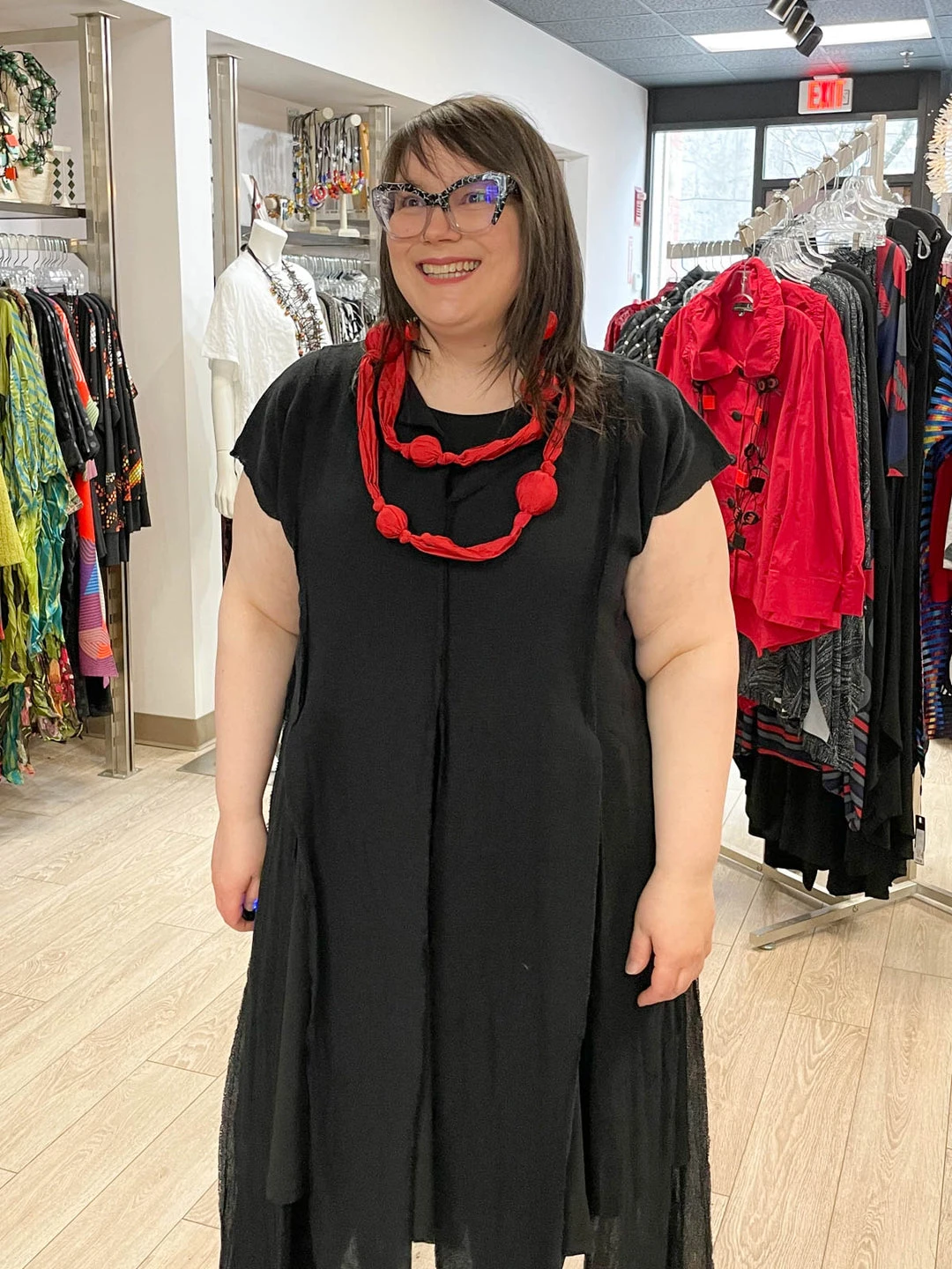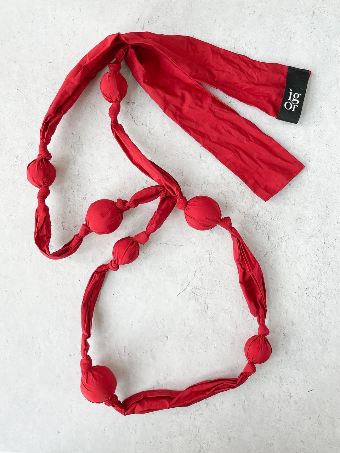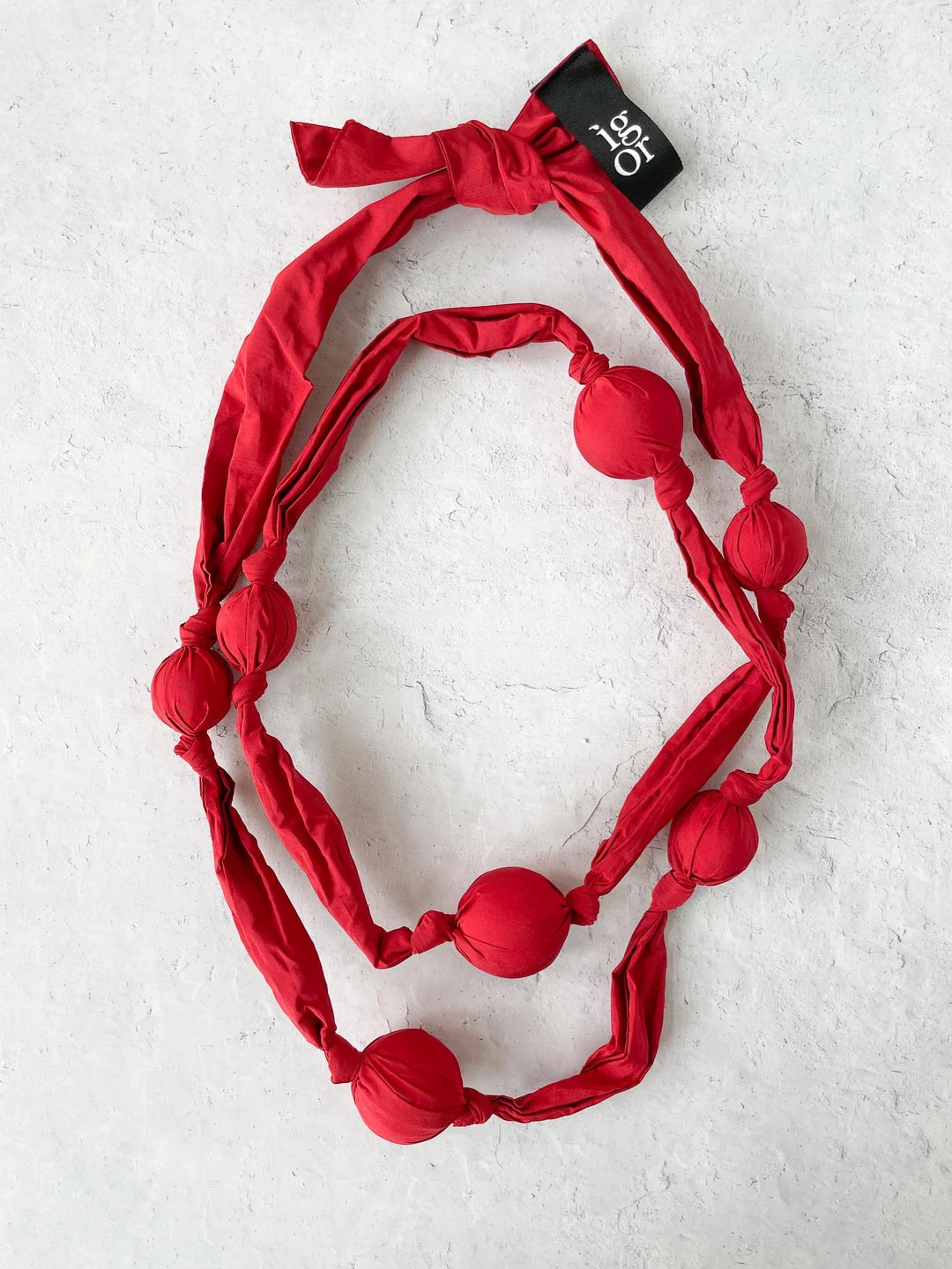 This tie back necklace features fabric covered balls with knots between in taffeta fabric. Can be worn at a belt or necklace – long or doubled up.Â