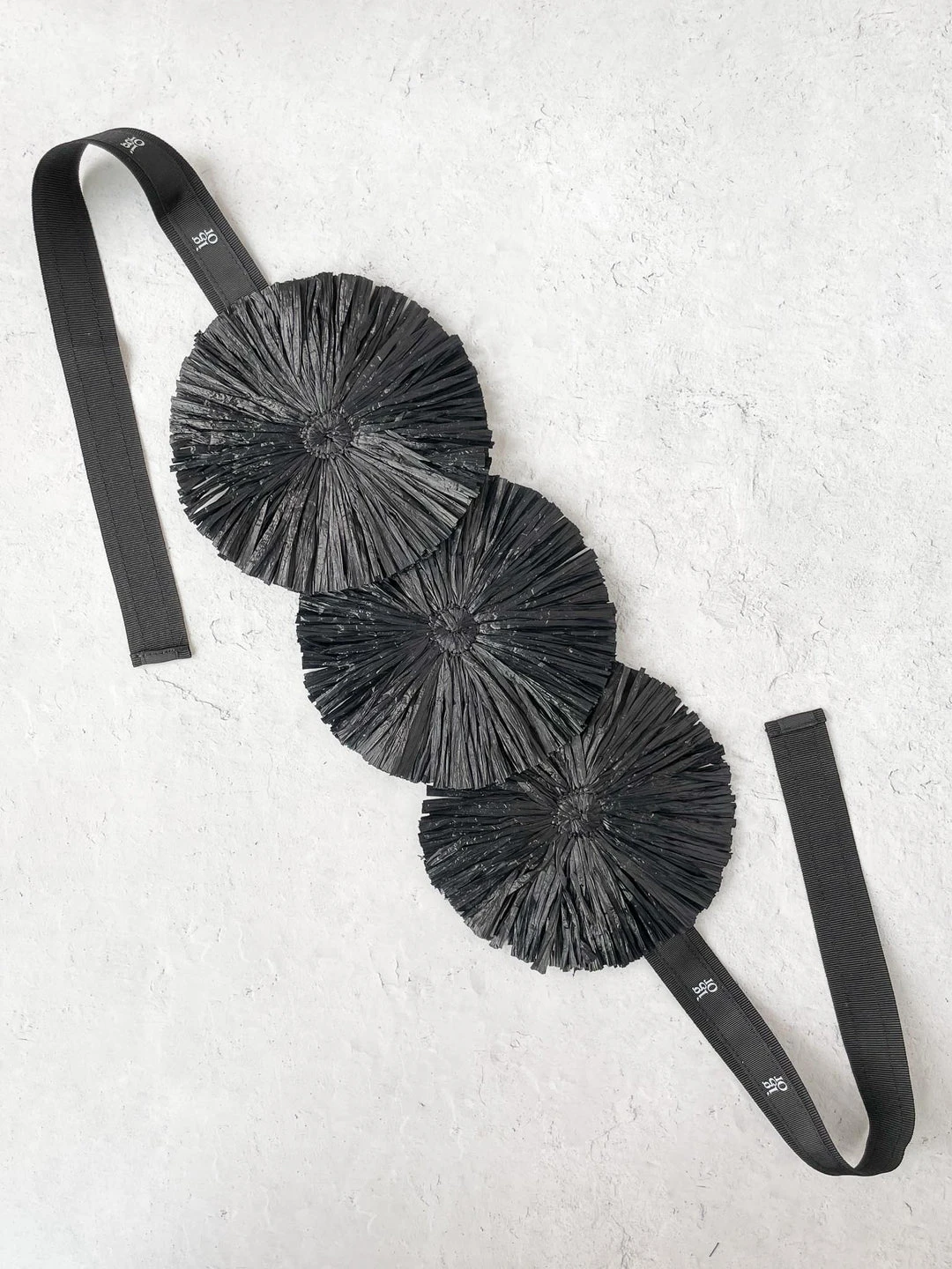 This versatile accessory can work as a statement necklace or tie belt. With three raffia flowers along coordinating grosgrain ribbon, this can be tied as you’d like.