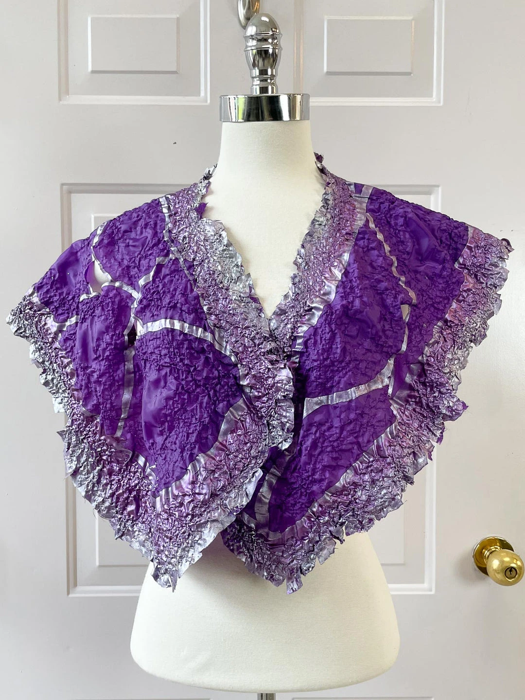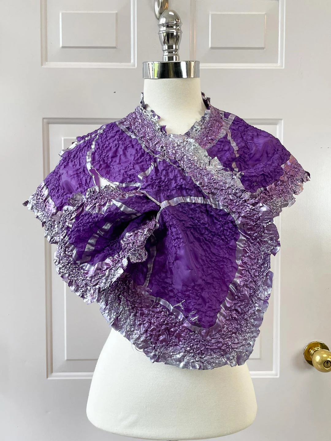 This short scarf by Spanish fiber artist Imma Costa features an avant-garde texturing technique along with strategicly placed cutouts for a one-of-a-kind look. Hand-painted accents stand out in coordinating metallics. Pull one end of the scarf through any of the holes for a statement look as unique as you!