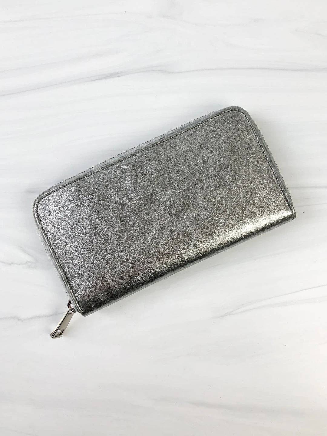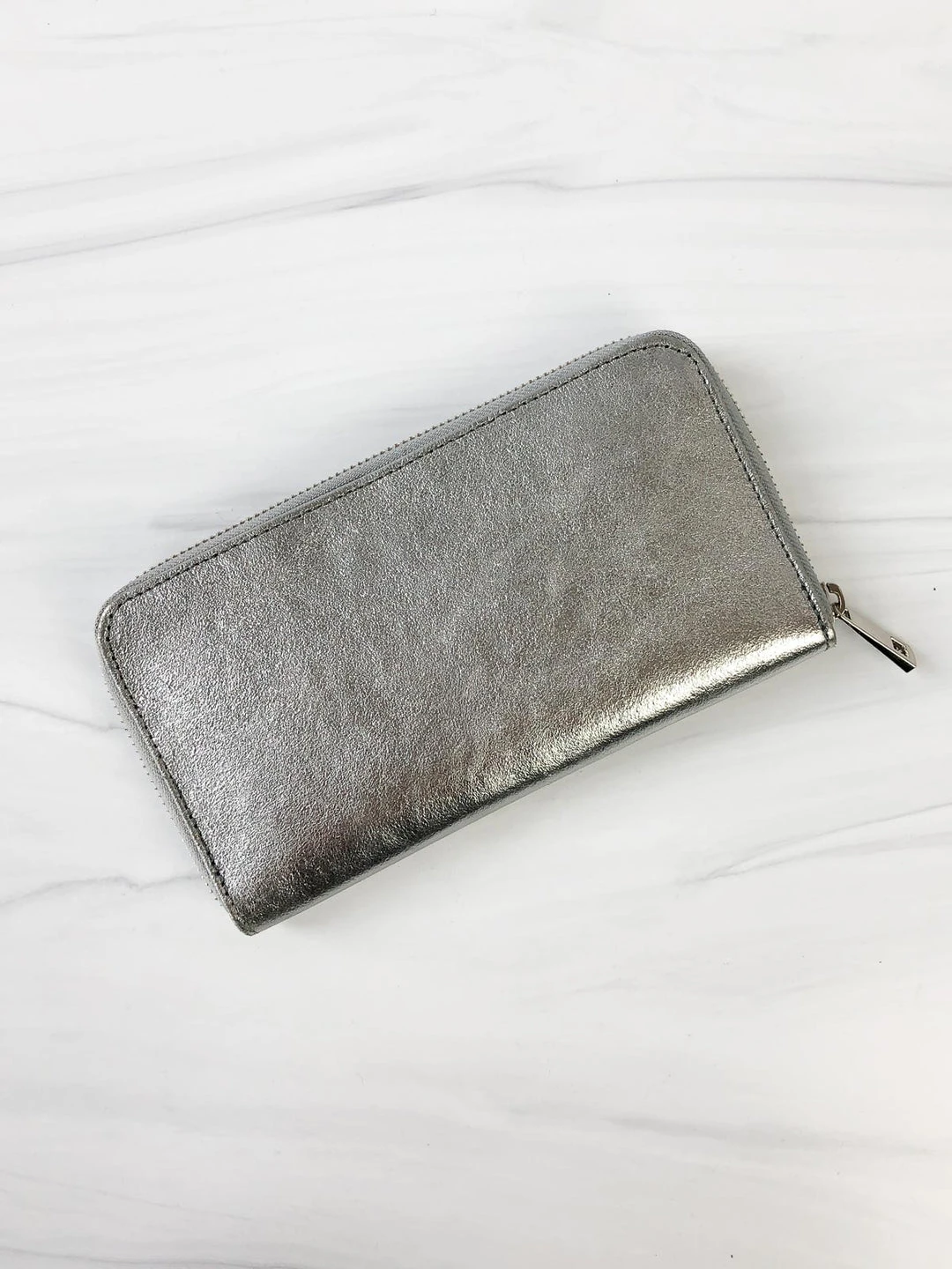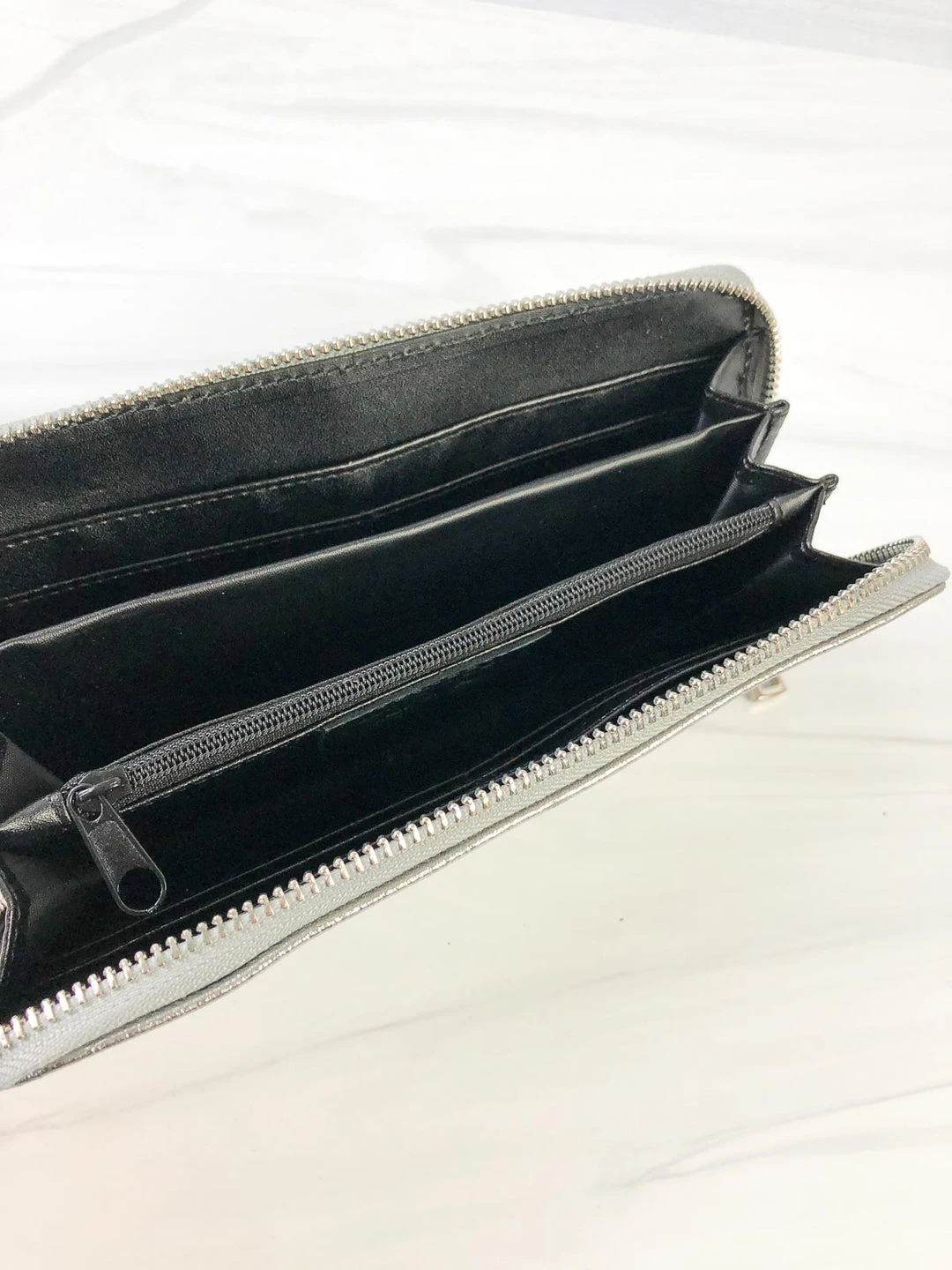 This rectangular zip wallet has compartments for everything! Four card slots on each side with a larger area for cash. Center has three larger open areas and a zippered compartment for coins. Full zip closure lets you open all the way. Black interior.Â