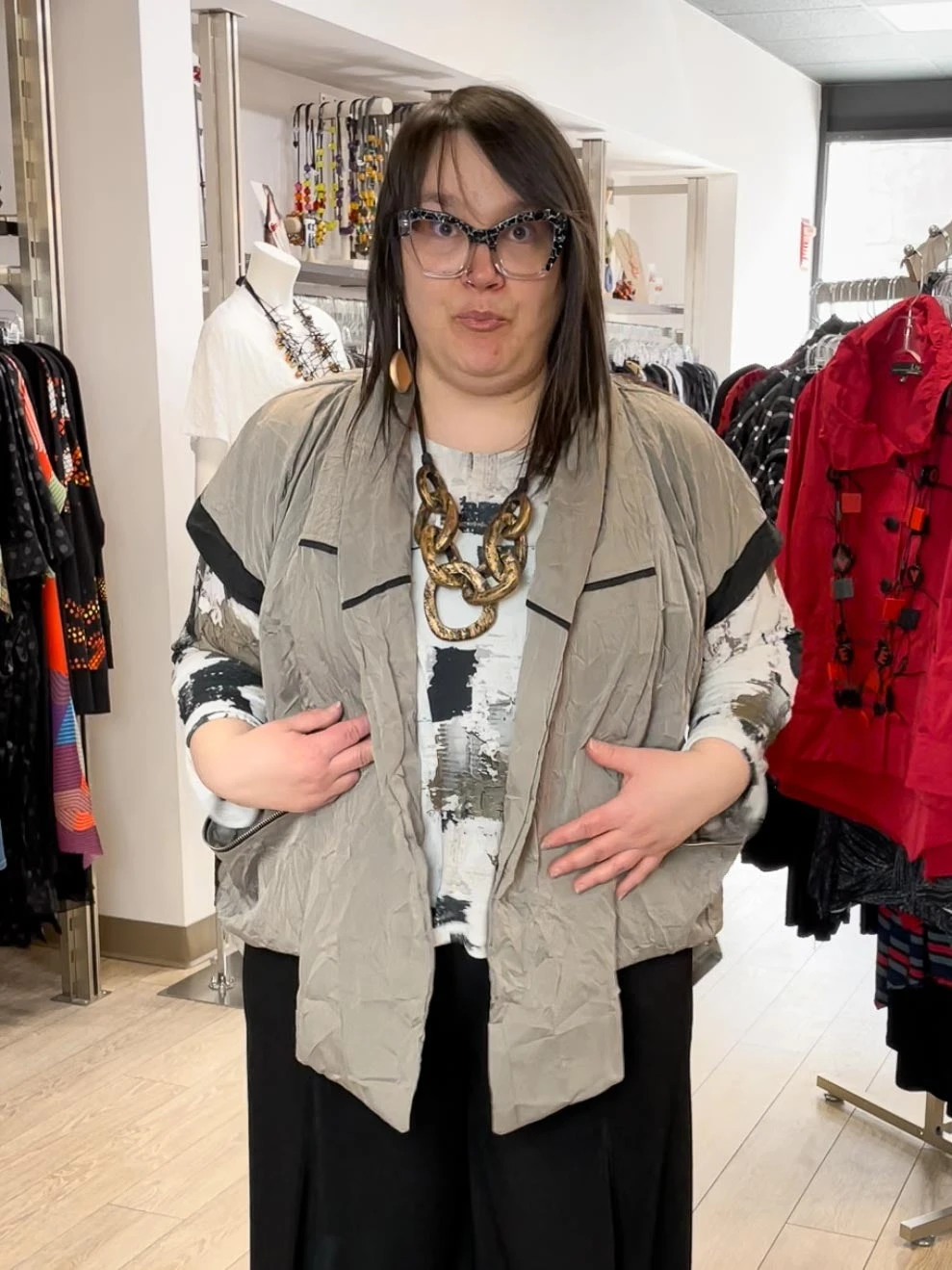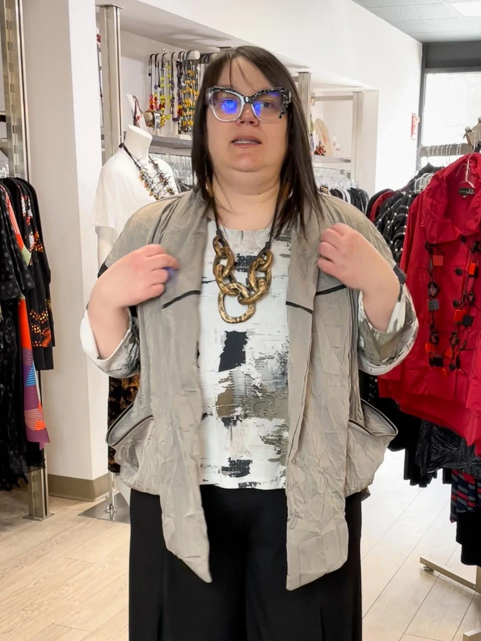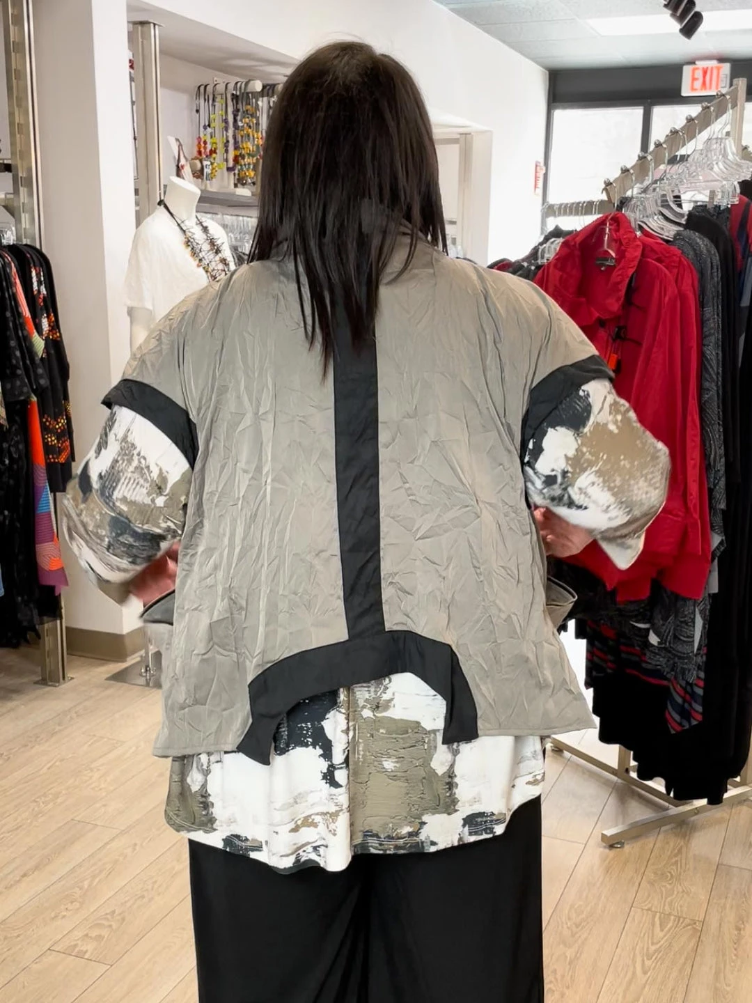 Kozan’s Athens Jacket is a statement piece with great details, including contrast trim and piping throughout, zipper accent swag pockets at sides and a half moon circular hemline at back. The full relaxed body, in a lightweight crushed taffeta, has short cap sleeves, a soft front lapel that hangs longer at center, and a vertical back panel in contrast color.