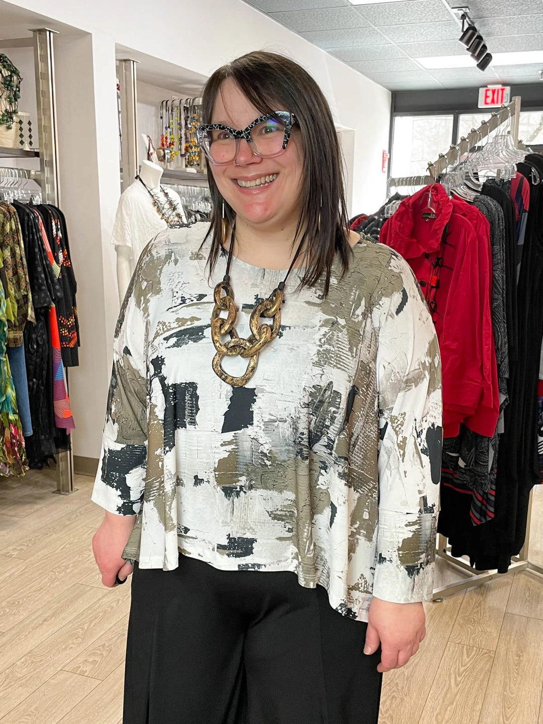 Andrea (size 14/16, 5’3″) wears size XL.
