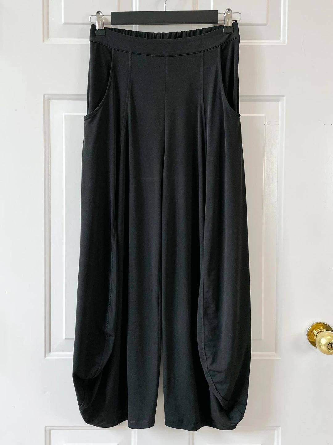 Kozan’s Jade Pant is a beloved style with a ballooned leg silhouette. Seam detail at legs create a full bottom while the horizontal and vertical stripes compliment for a flattering look. The pull on waistband has stretch elastic at back, with pockets at side seams. Kozan’s Black Vogue fabric is a solid stretch jersey knit, great for travel.Â