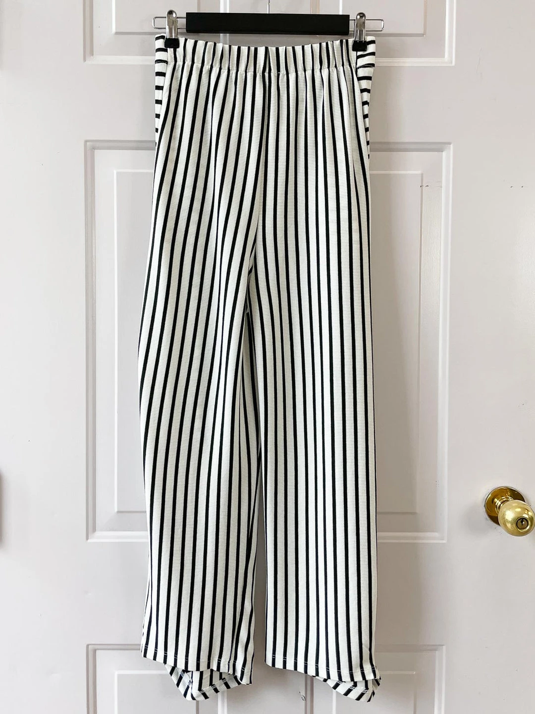 Kozan’s Jade Pant is a beloved style with a ballooned leg silhouette. Seam detail at legs create a full bottom while the horizontal and vertical stripes compliment for a flattering look. The pull on waistband has stretch elastic at back, with pockets at side seams. Kozan’s Lanes fabric is a ribbed knit in creamy white with black stripes.