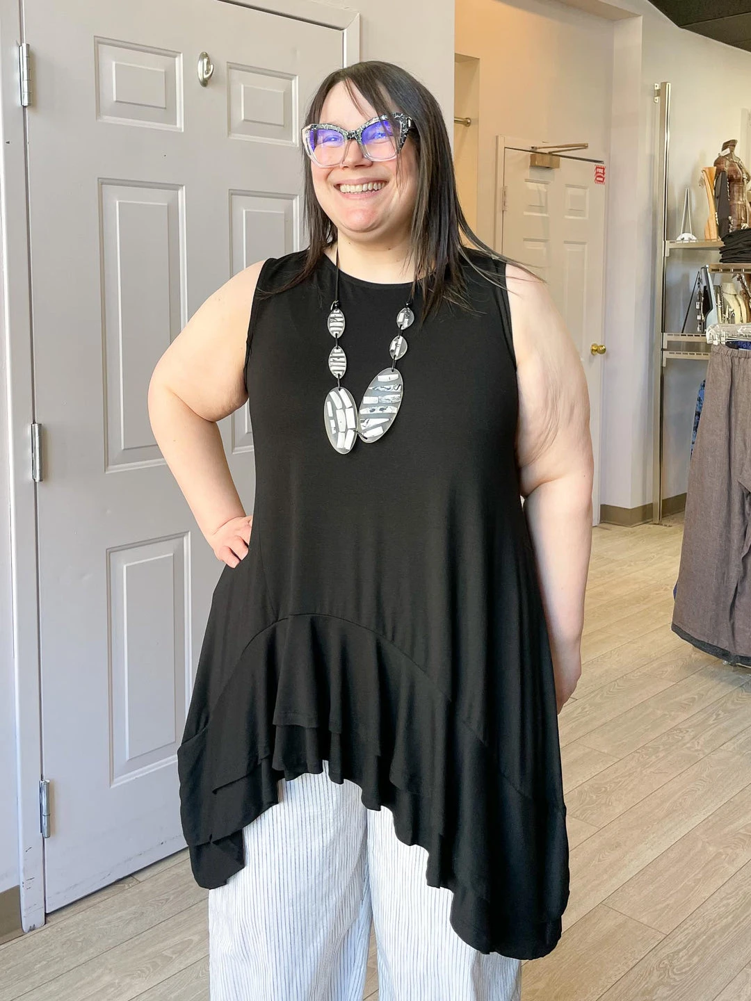 Andrea (size 14/16, 5’3″) wears size XL.