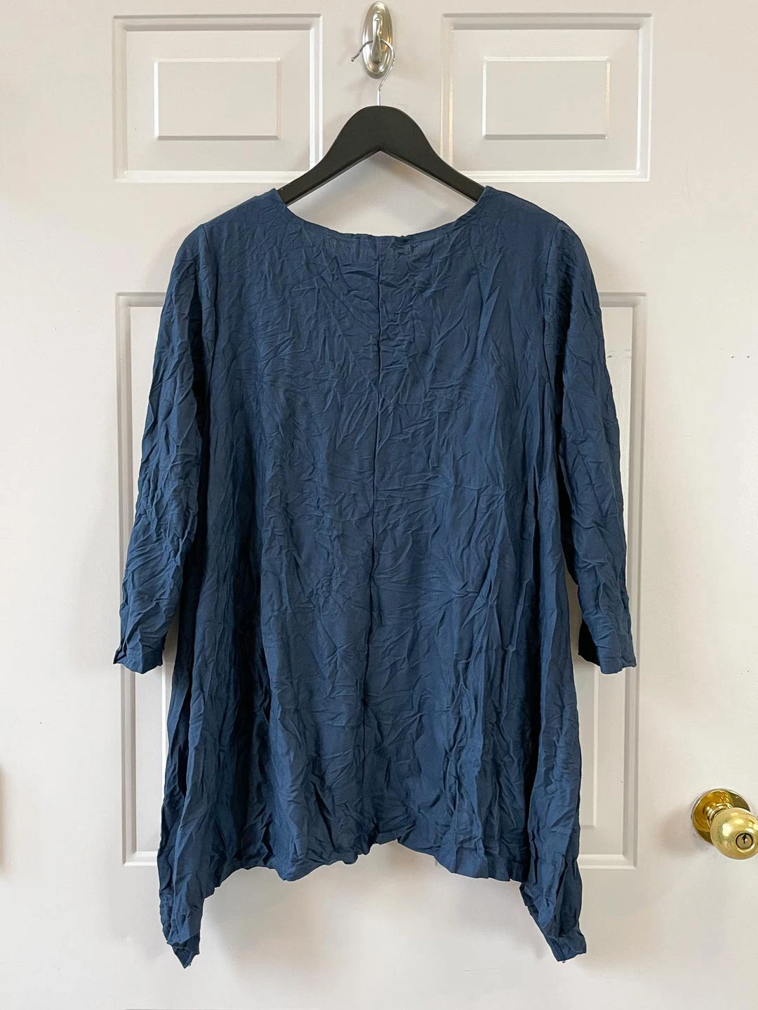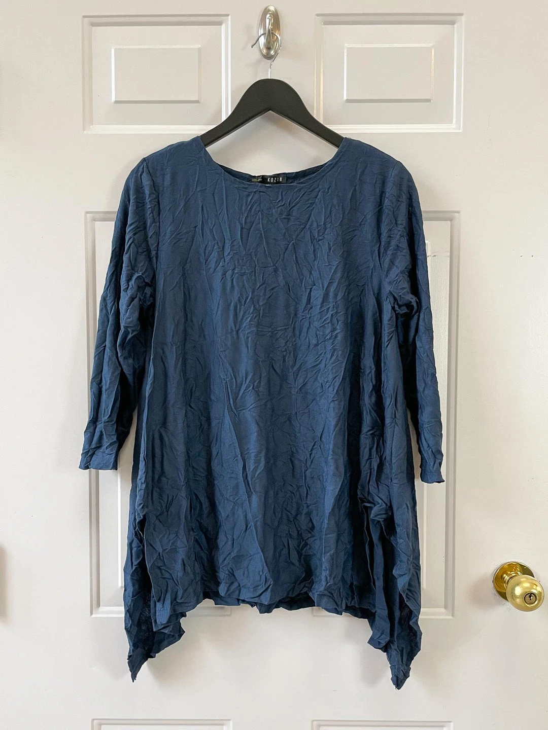 Kozan’s Juliet Top is a beloved and best-selling silhouette with a flared a-line body and notched details at the curved hemline. A round neckline and three quarter sleeves complete the look. The crinkle knit is perfect for year round wear.