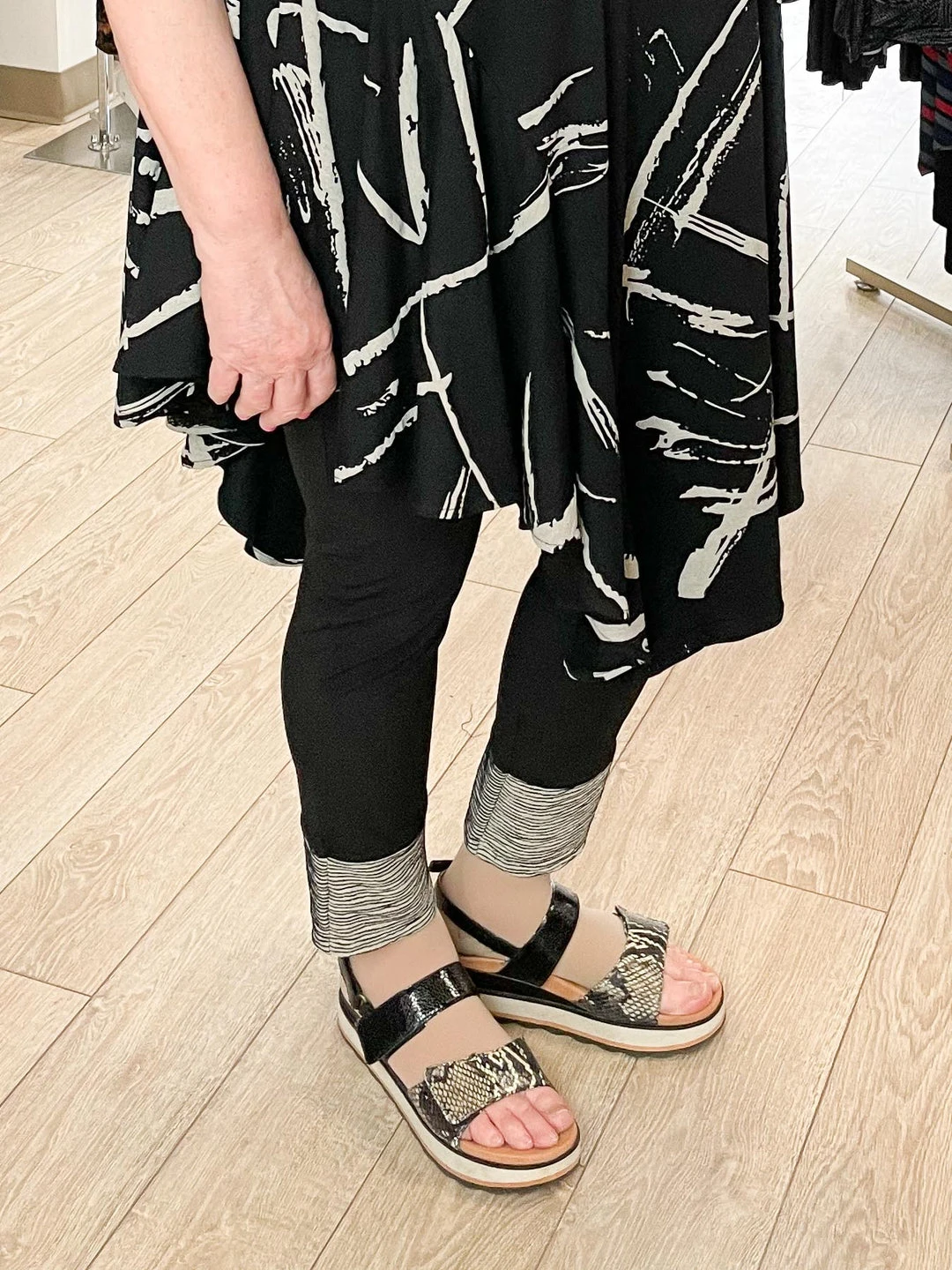 The Maya Legging from Kozan features a solid black stretch jersey knit body with accent panels at ankles. The Latte fabric is a wavy textured knit in tonal taupes.
