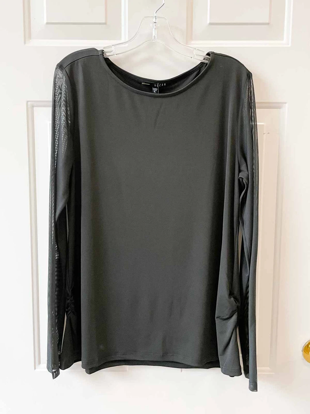 This easy tee is perfect for layering with a solid stretch jersey knit body and sheer mesh sleeves. The slimmer silhouette features a round neckline, ruche detail at the sides of the even hemline, and long set-in sleeves. A great top worn on it’s own or layered under anything from an open cover up to a sleeveless dress.