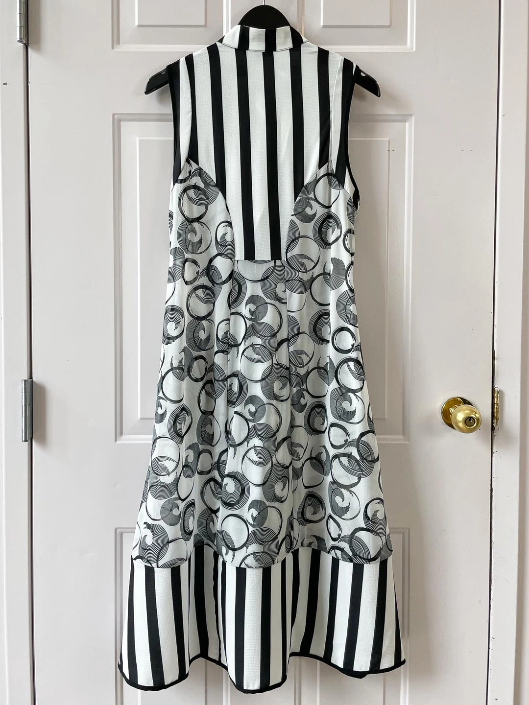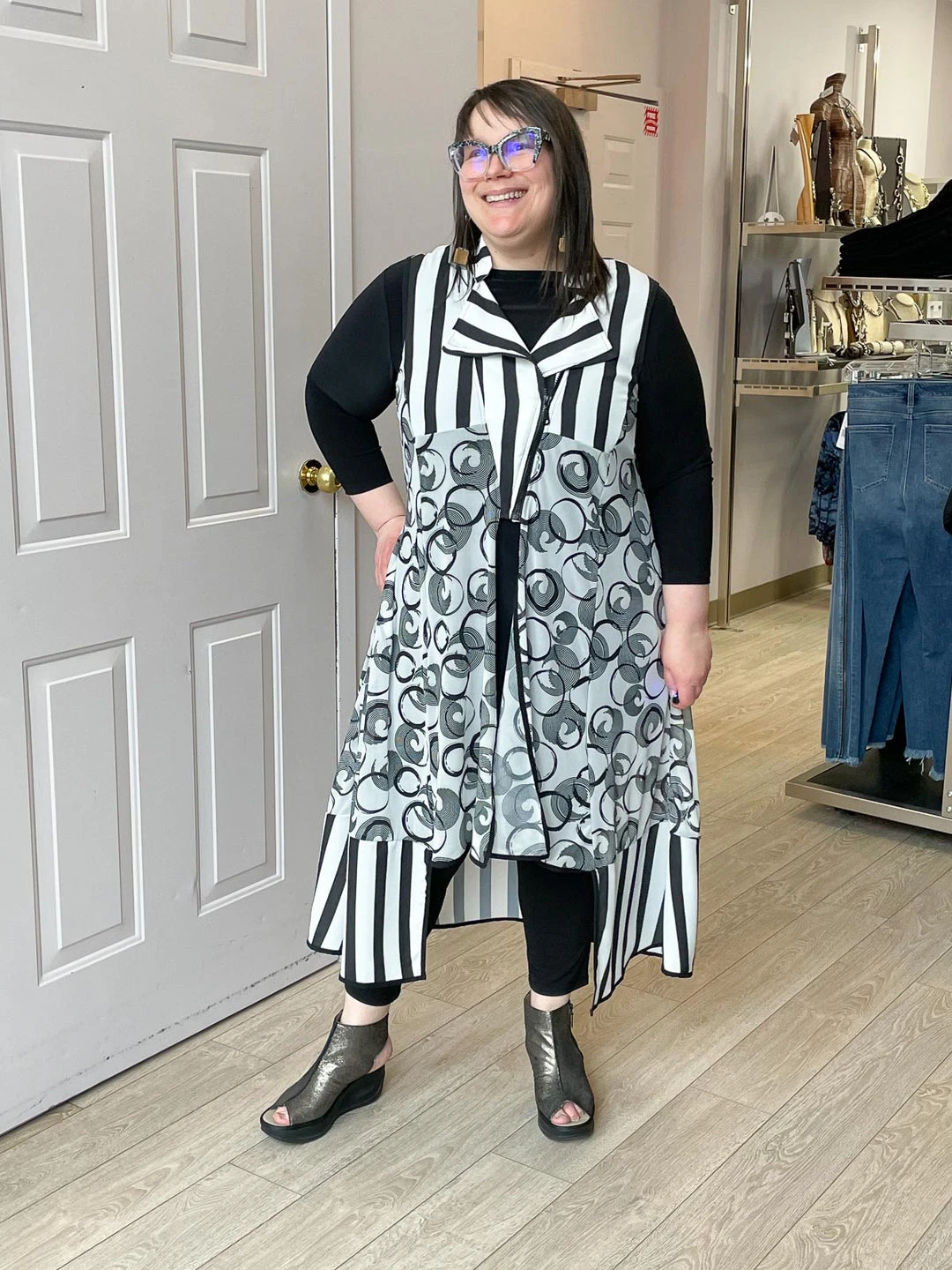 Kozan’s Myla Duster vest is a truly stand out style, with a longer length sleeveless body in a mix of printed mesh and striped crepe. The slim bodice has angled seaming along with an asymmetric zipper to waist. Worn closed the neckline has an open stand up collar, while worn half zipped it’ll show off notched lapels. The front is open from the waist down with a paneled stepped hemline and side seam pockets. The back features unique seaming details, as well. This playful piece is sure to add a little art and a lot of edge to your look! The Rings mix features black and white circle printed mesh with black and white striped lightweight crepe.