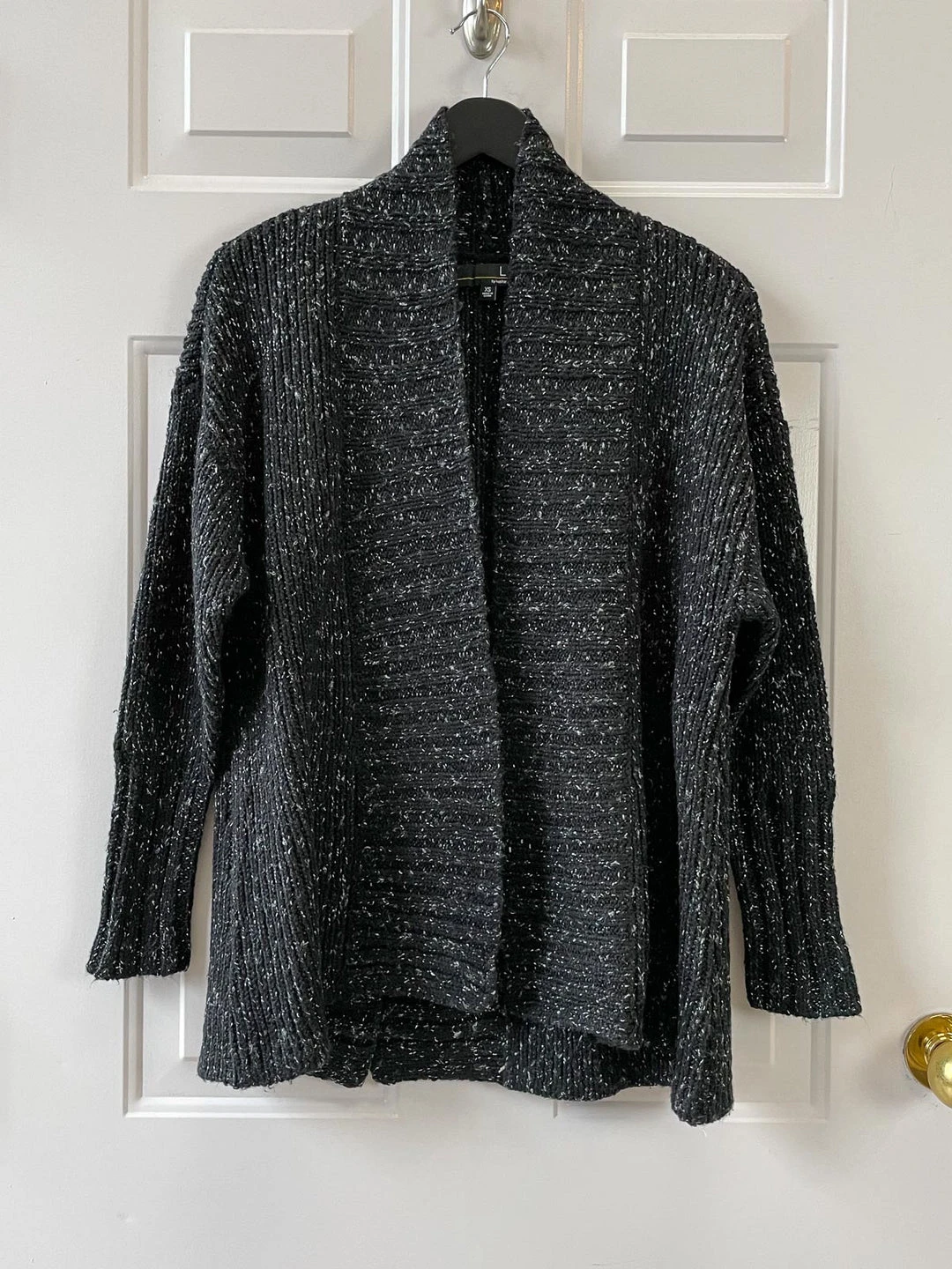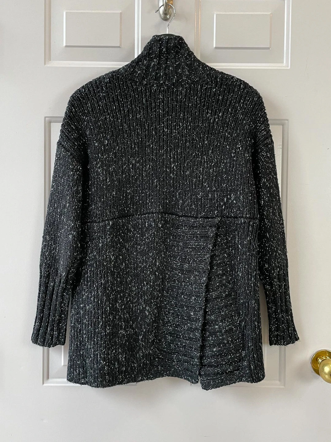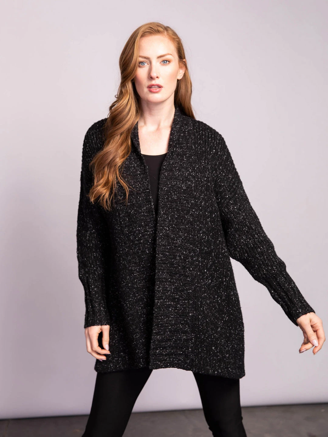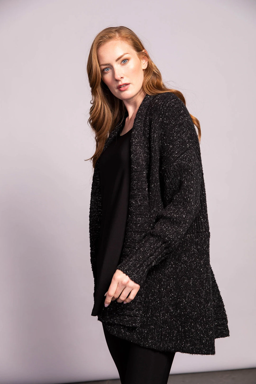 This roomy sweater cover up features dropped sleeves and a back vent with ribbed knit trim.