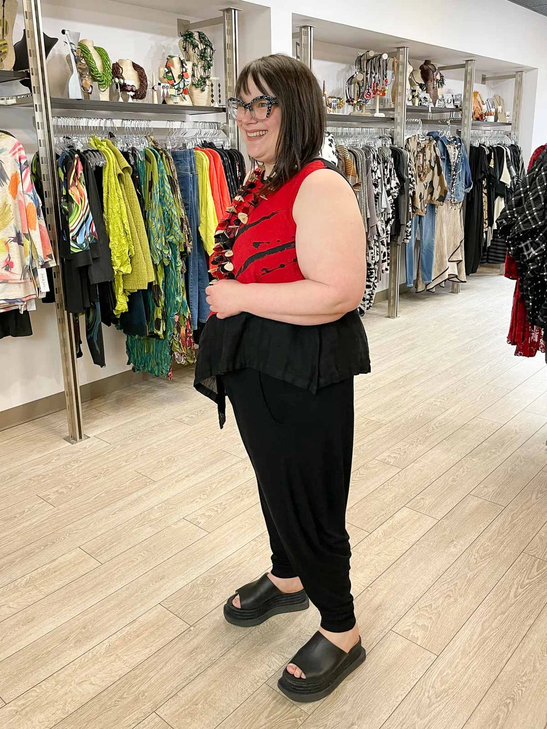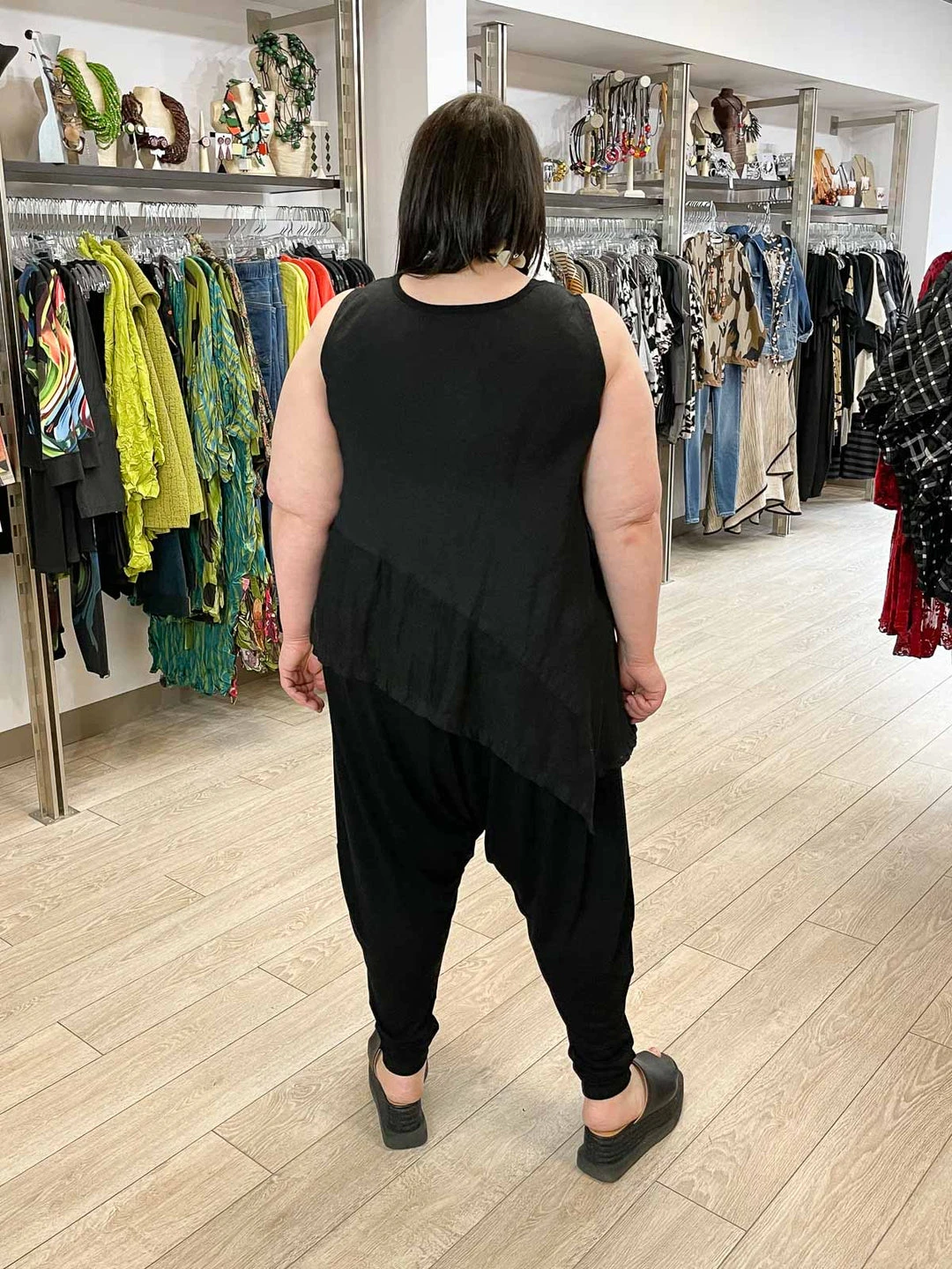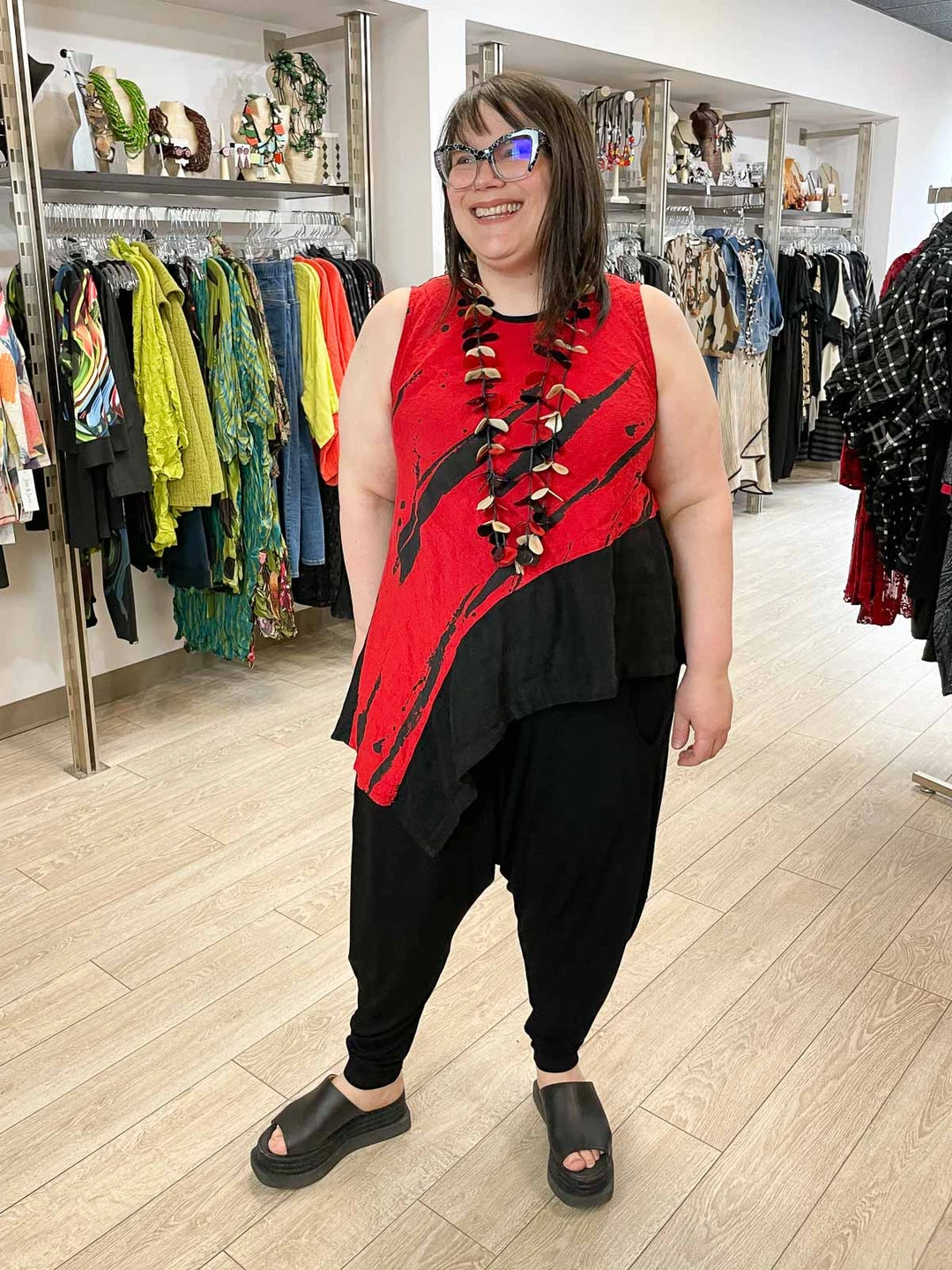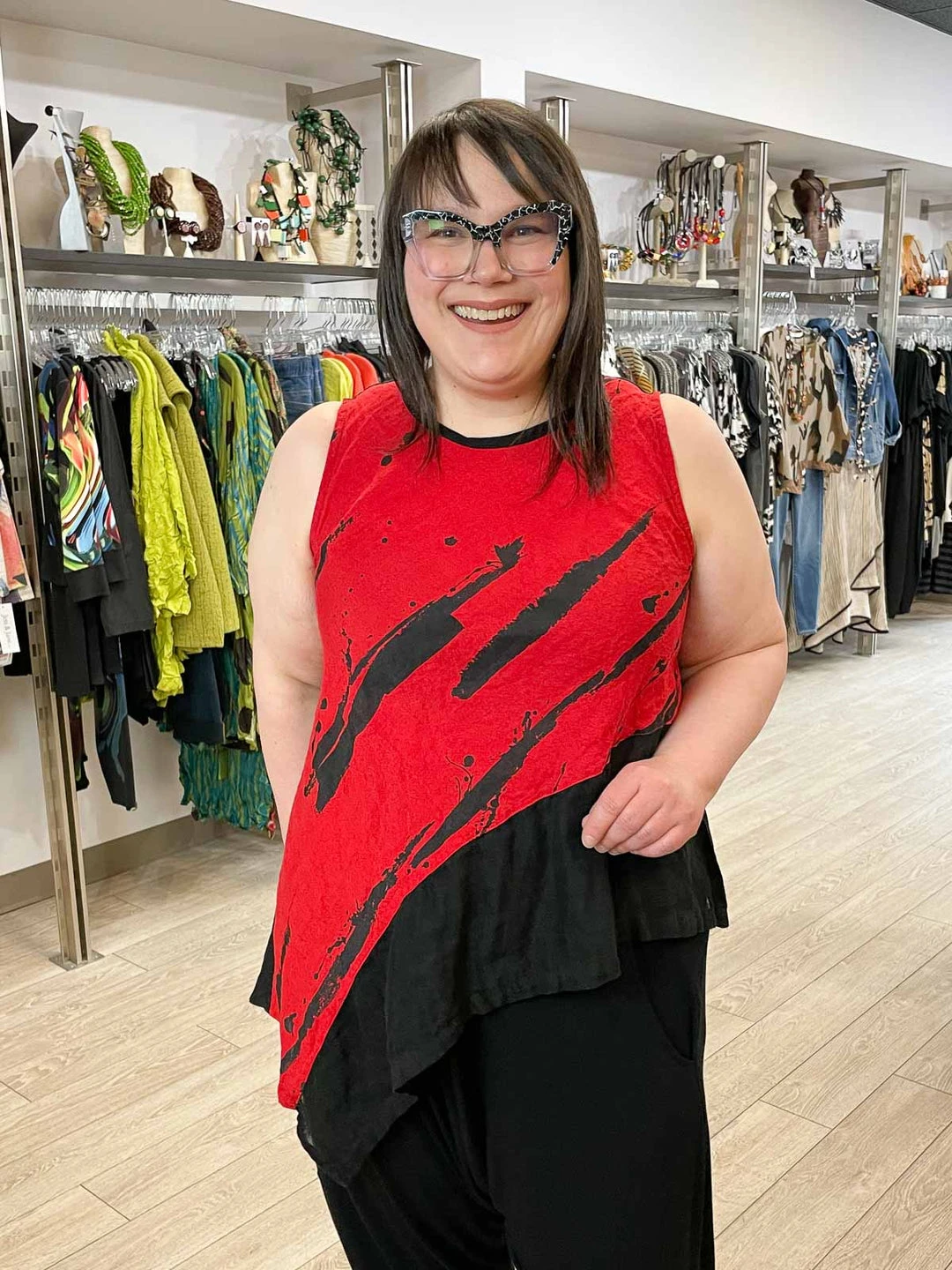 This asymmetric tank has a paneled hemline that is shorter on one side. The solid red body has brushstroke printed accents, while the back is solid black. The sleeveless silhouette is bias cut with contrast detail at the round neckline and arm holes.