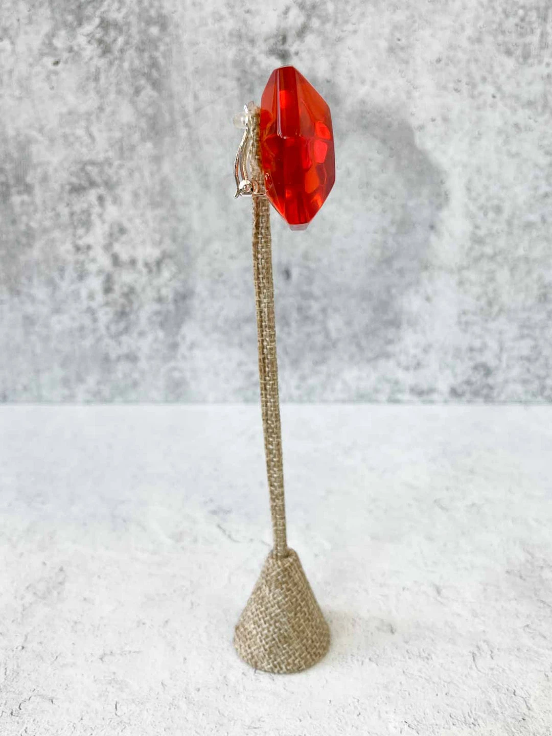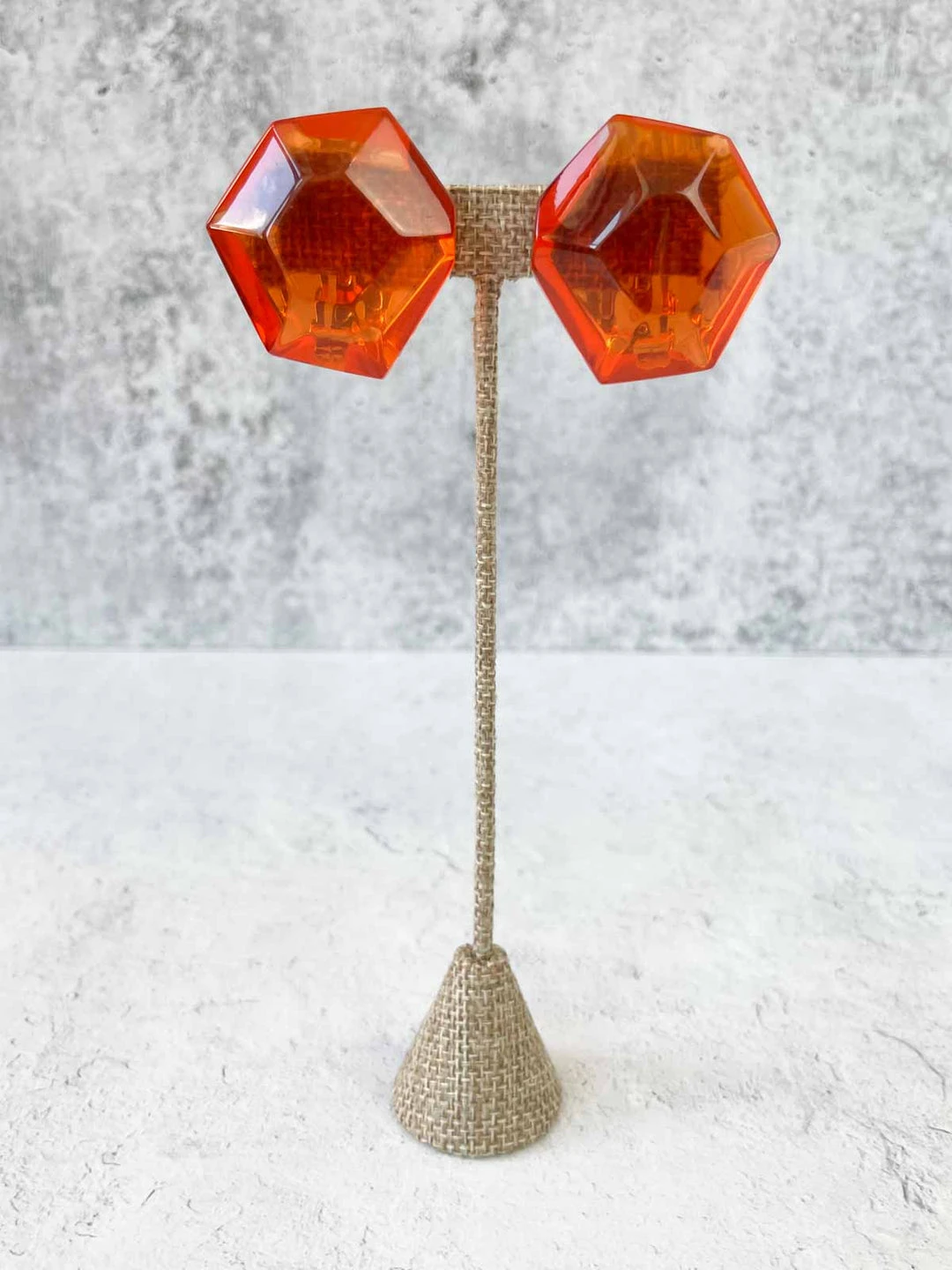 These clip on earrings have a gemstone effect in high shine orange resin with a faceted geometric shape.
