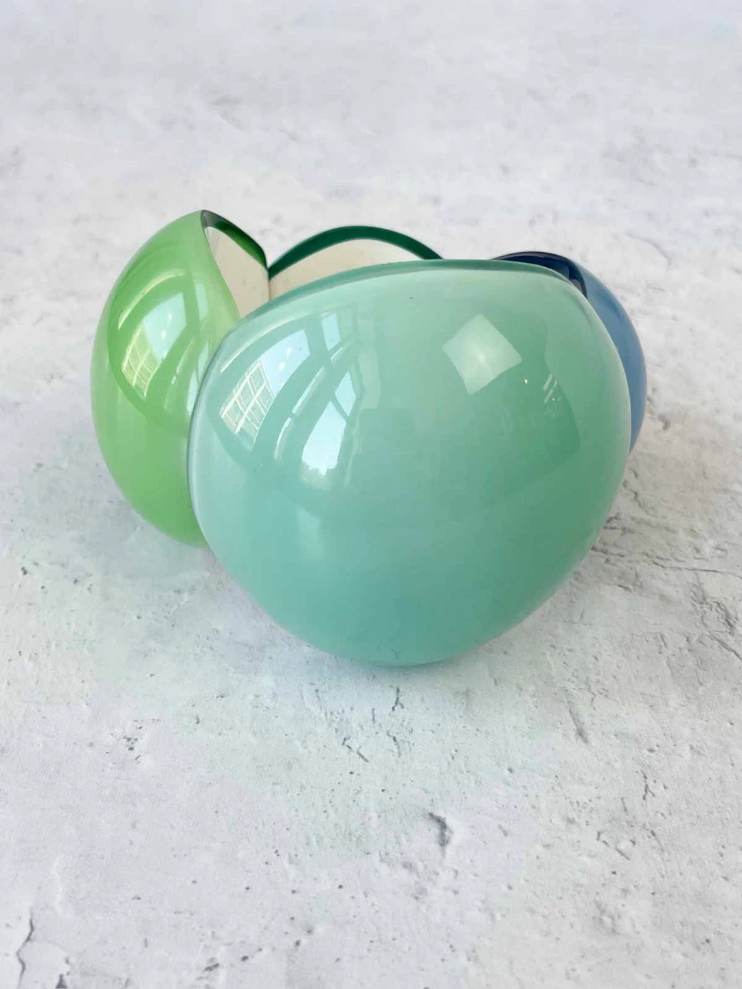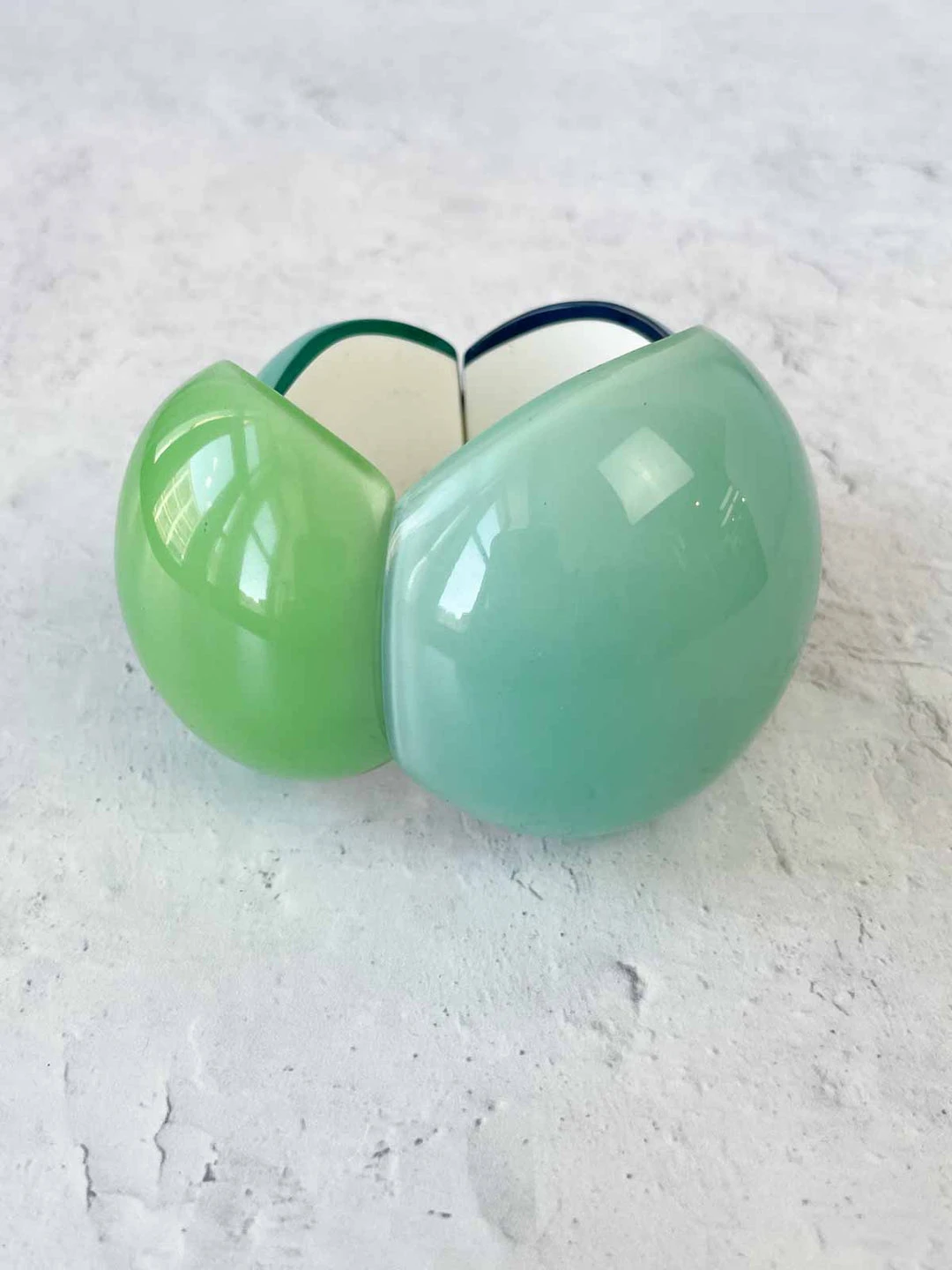 This statement cuff bracelet features four large domed bubble shapes in soft aqua and pale blue high shine acrylic. On stretch cord, this cuff slips over the wrist and has a bold three-dimensional effect.