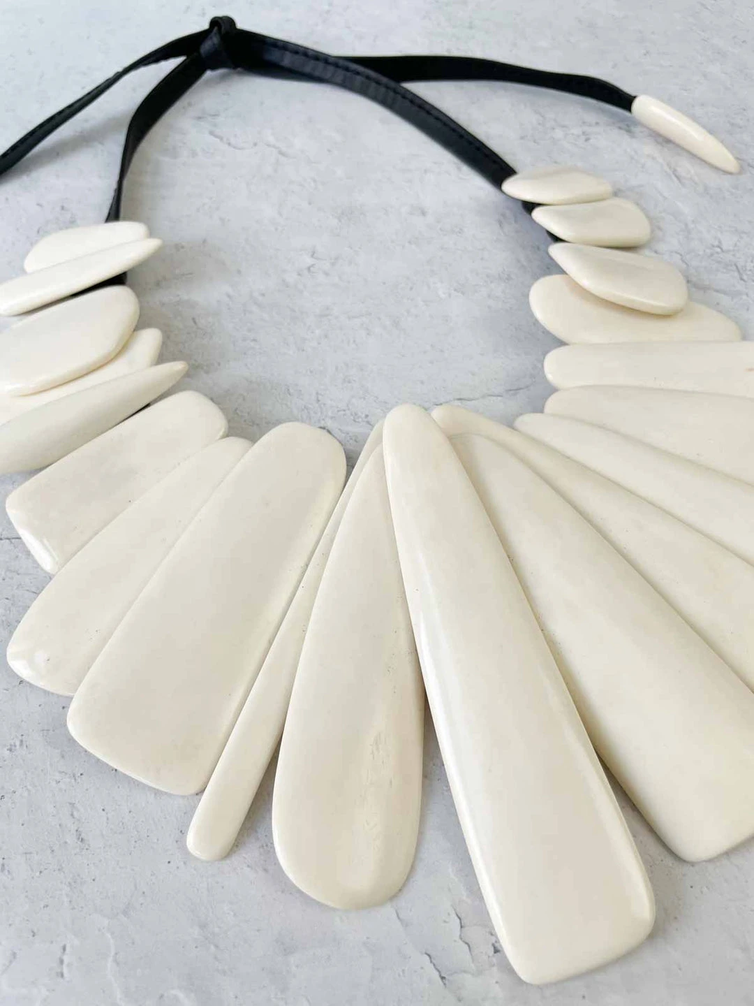 This large statement necklace features a bib of polished natural bone on leather cord. The organicly shaped piece are larger at center (with a 5″ drop) and taper to the ends. The leather tie back is finished with matching bone tips.