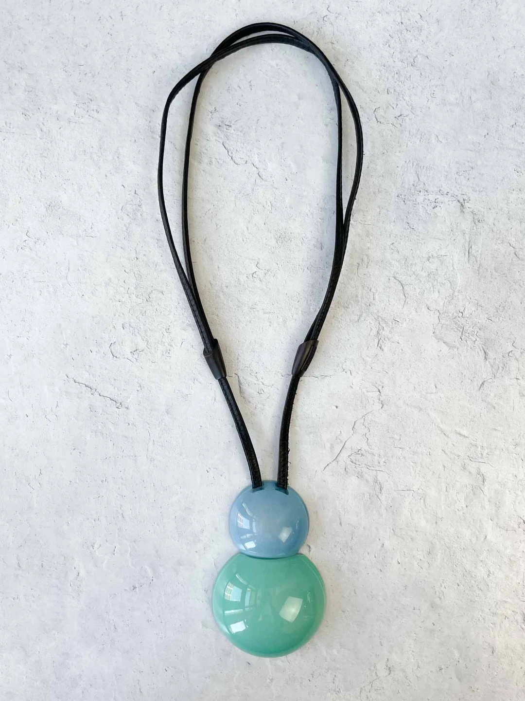 This classic pendant has a modern feel, with two large dome bubble shapes in soft aqua and pale blue high shine acrylic. Leather cord adjusts, so you can wear at whatever length you please.