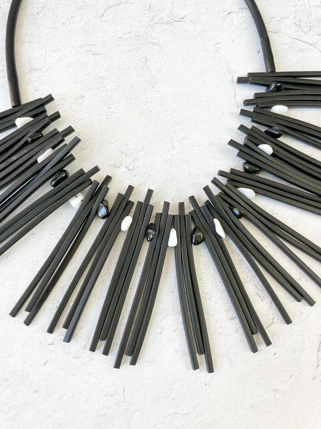 OC’s Chips Necklace is a bib style with black and white faceted resin “chips” between trios of rubber strips. This style can be lengthen with one of our extenders.