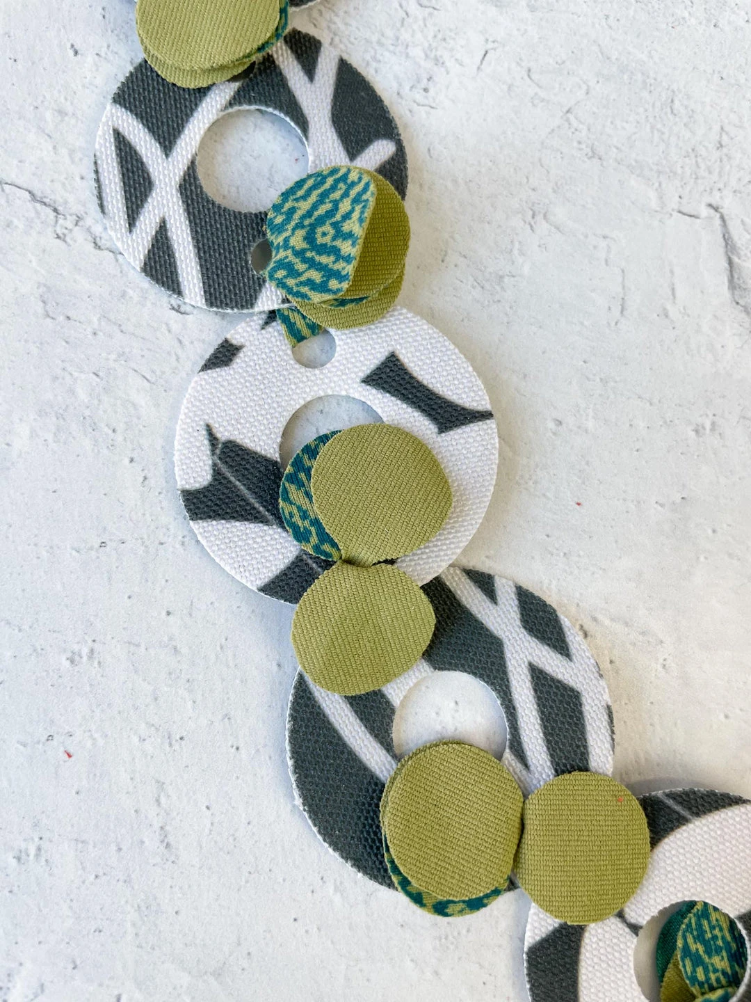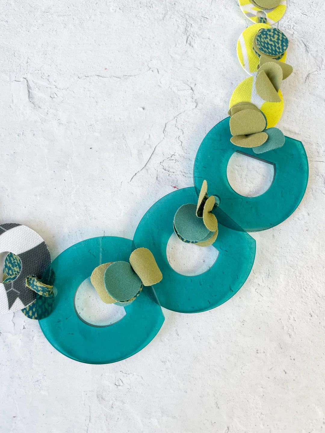 Artist Criselda Lopez creates unique wearable art using a range of upcycled materials. This long necklace features open cut-out die cut shapes in acrylic and textured fabric sheeting, all linked together with coordinating fabric or leather.