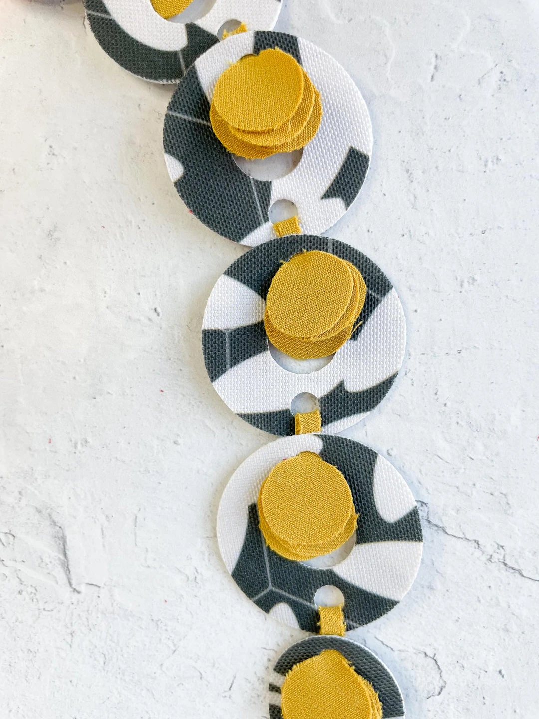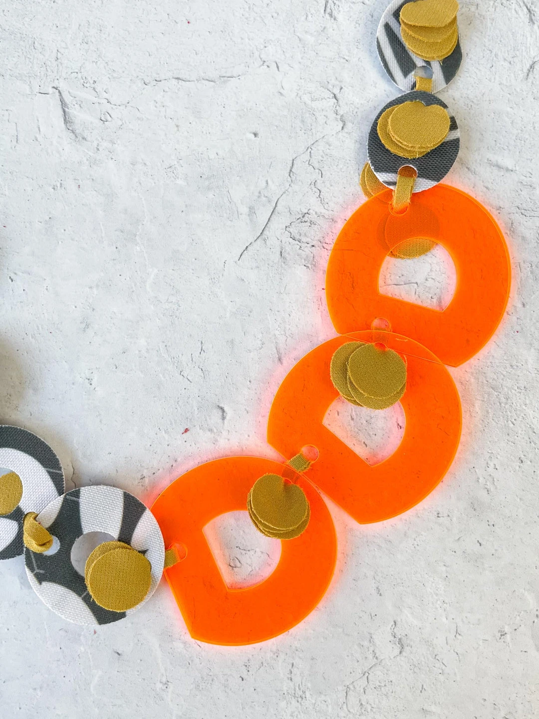 Artist Criselda Lopez creates unique wearable art using a range of upcycled materials. This long necklace features open cut-out die cut shapes in acrylic and textured fabric sheeting, all linked together with coordinating fabric or leather.