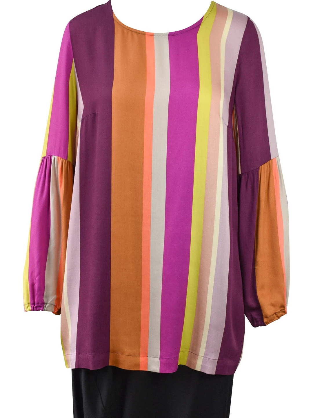 This chic blouse mixed bold stripes in a mix of brown, burgundy, magenta, charteuse and bright coral. Straight relaxed body has darting at bustline and a round neckline with buttoned opening at back. Long set-in sleeves have gathered detail with elasticized hems that can be scrunched up the arm.