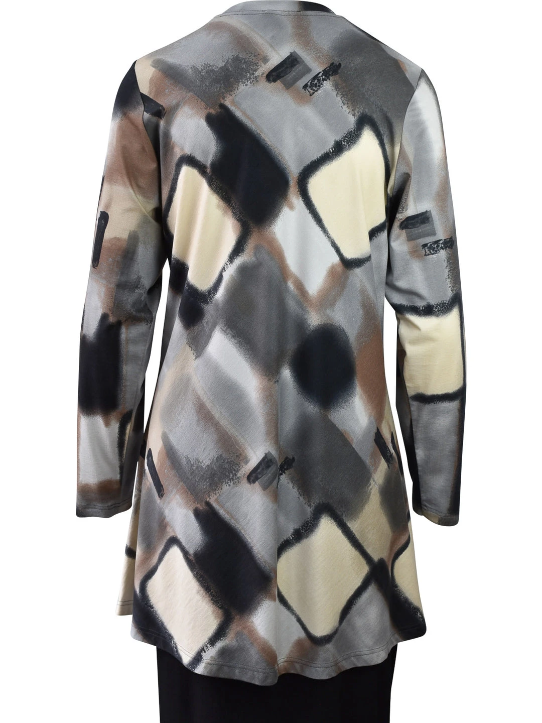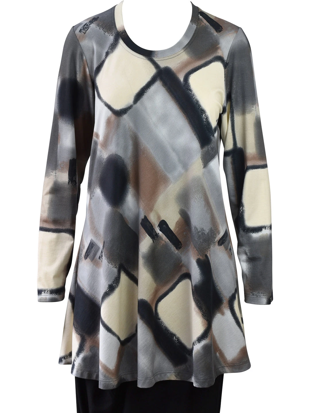 Q’Neel’s prints stand out and this one catches the eye with rich neutral tones taupe, greys, black and ivory. This long sleeve tunic has a round line and slim a-line body with even hemline.