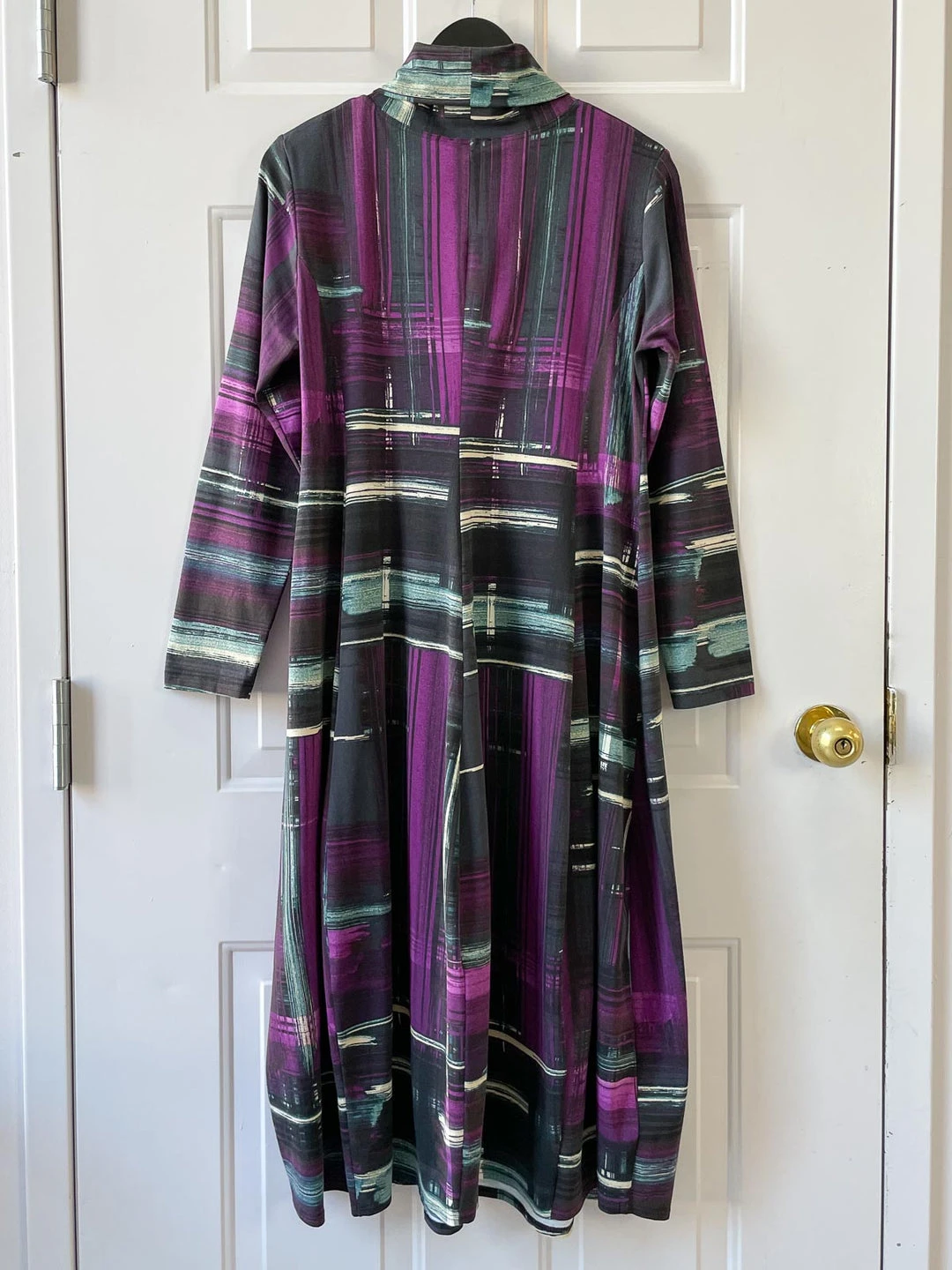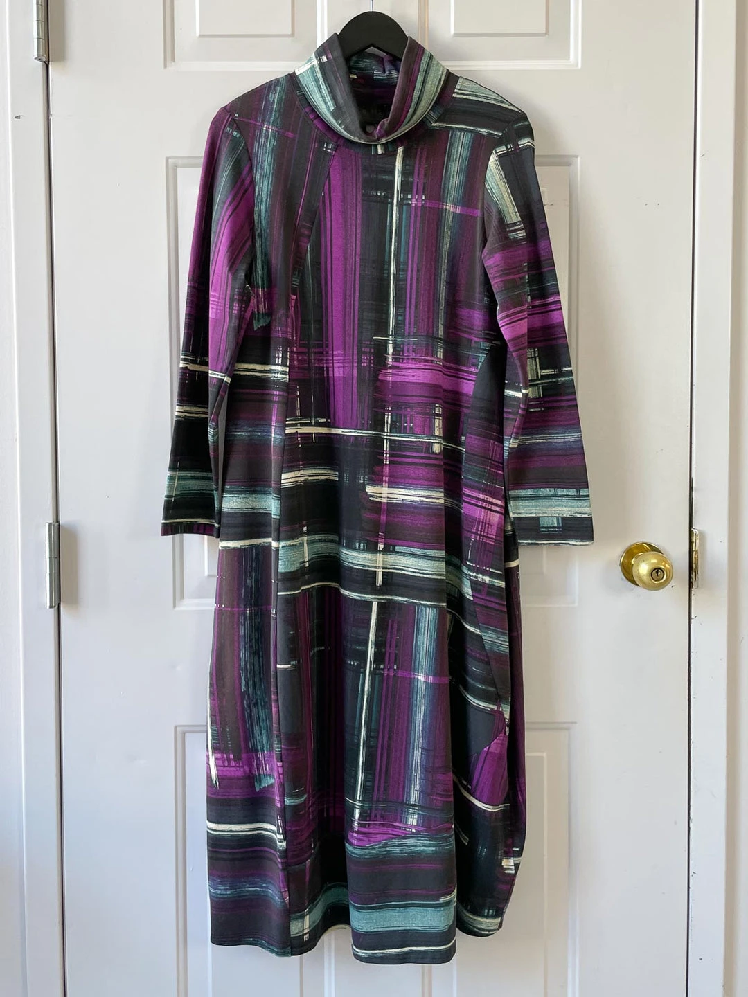 In a beautiful brush stroke print of magenta and teal hues on a base of dark blue-grey, this midi dress stands out with a slim fitting body that features a-line seaming. The skirt balloons below the waist for a flattering fit that skims the body. A fold over turtle neck and long set-in sleeves complete the look.