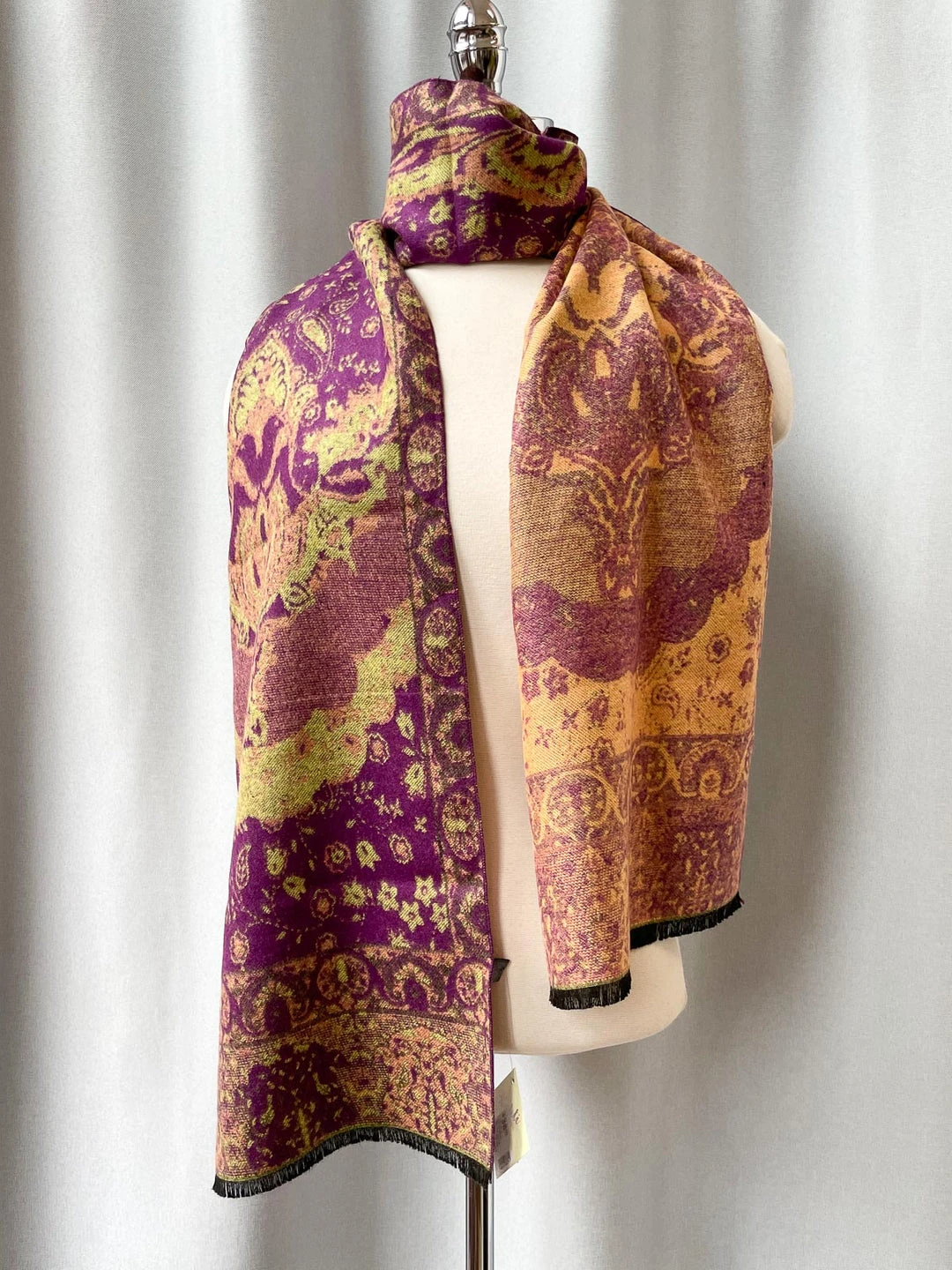 This long rectangular scarf shows off a reversible art pattern in soft brushed cashmere. Ends have 1/4″ black fringe. The perfect accessory for any fall or winter ensemble!