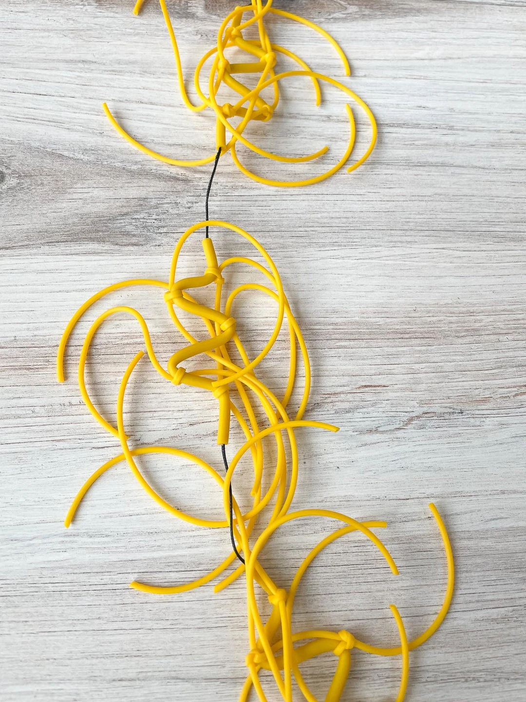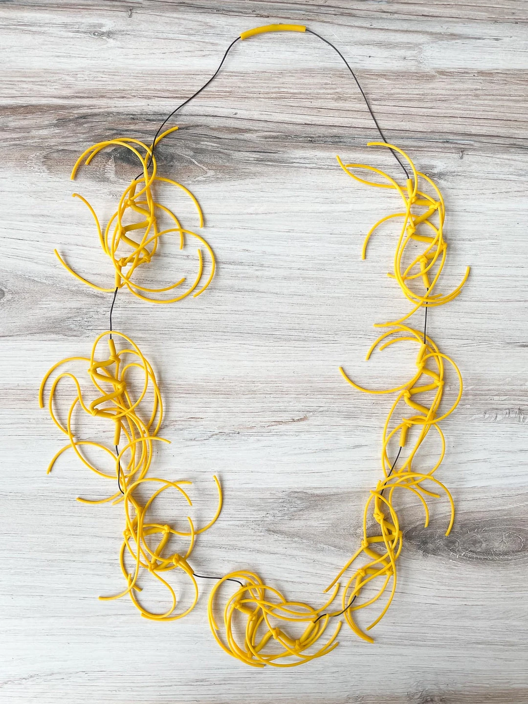 This lightweight piece is artful and fun with coordinating knotted rubber strands dotted along zig zag wired rubber cords on thin black threading.