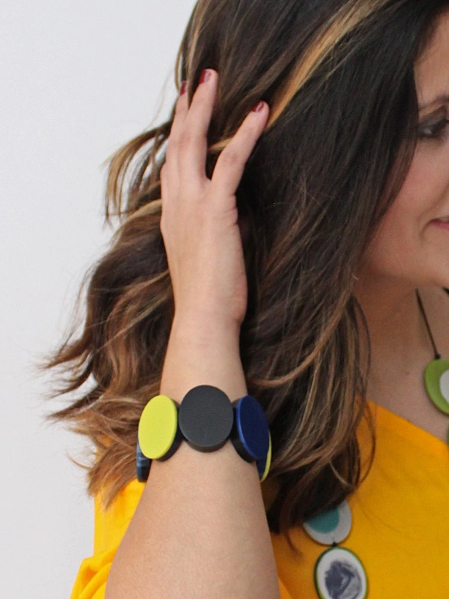 This lightweight resin bracelet is a must-have for any season and every wardrobe! The elastic allows this to be slipped on easily – no clasps! Resin beads in a mixed colors with a base of navy make up this one-of-a-kind bracelet, so it will go with anything and everything!