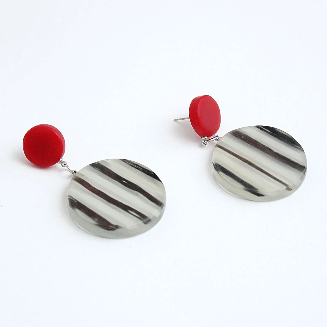 These chic earrings are handmade of translucent resin and hang in a round shape. Detailed with raffia stripes in coordinating colors that dangle from a black stud for added dimension. Very light but stunning, these beautiful earrings will make a statement with any outfit!