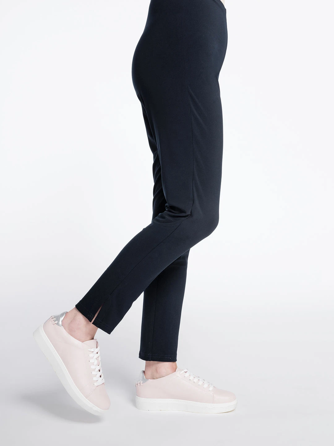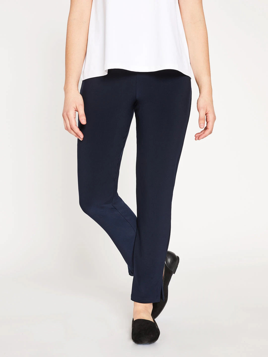 An everyday basic, this style has a narrow leg with a side slit at hem. A great alternative to a true legging! Length is perfect for shorter fashionistas.