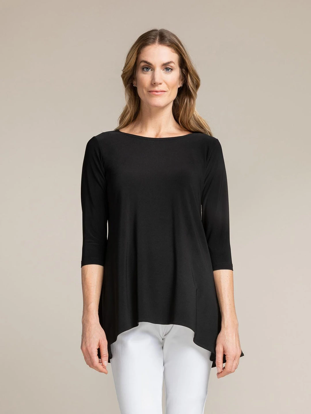This Sympli essential features a high low hemline with an easy flared a-line body. Rounded boat neck with three quarter sleeves.