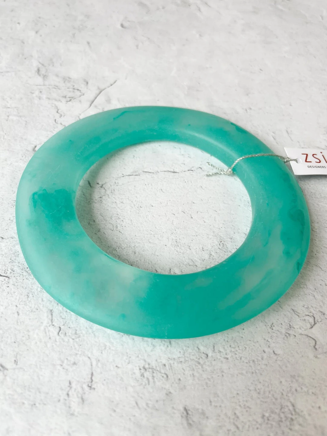 Part of Zsiska’s “Isla” collection, this bold bracelet features marbled translucent resin formed in an organic flattened bangle. Pair back to the matching Isla stretch bracelet for the perfect arm candy!