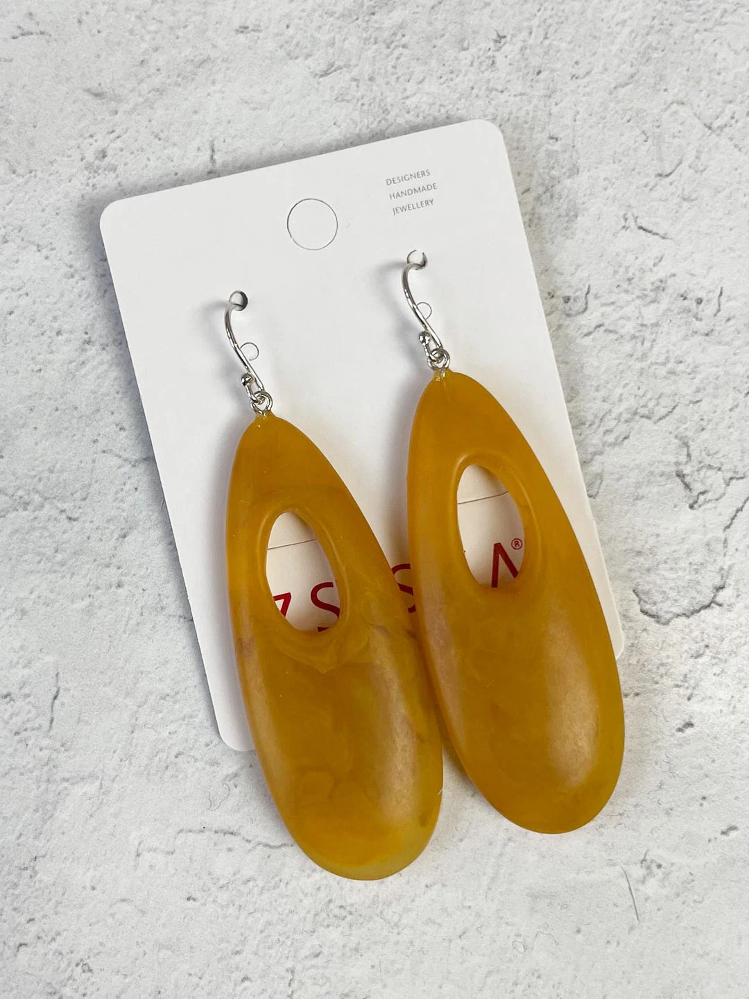 Part of Zsiska’s “Organic” collection, these earrings feature long oval shaped drops with open cut out in matte finish marbled resin hanging from silvertone ear hooks.
